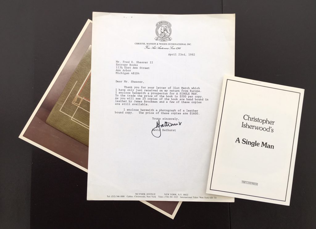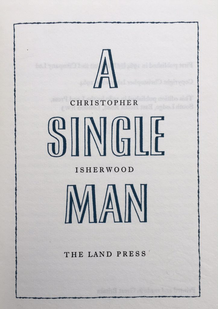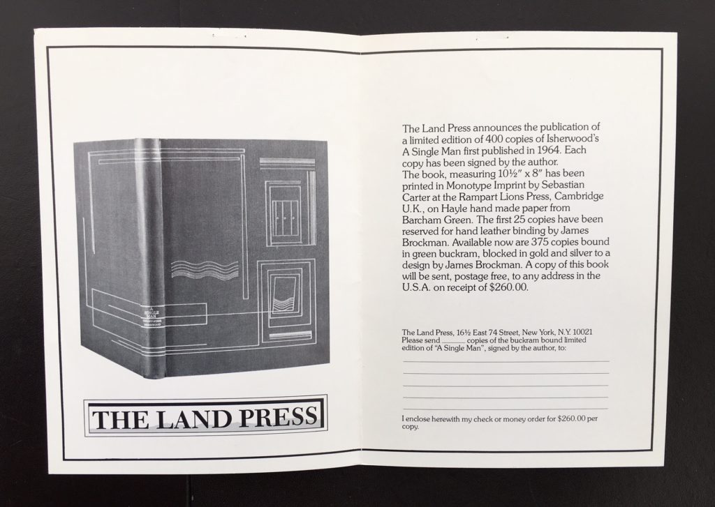 A special Limited Edition published by the Land Press in 1980. The BOOK is in Fine condition. Original blue cloth, titles to spine gilt, decorations to covers gilt and silver designed by James Brockman. With the original blue cloth slipcase as issued in near Fine condition. This is number 31 from an edition of only 400 copies which were Signed by the Author and printed on Barcham Green paper. Accompanied by firstly, the loose Prospectus and secondly, a printed letter from Christie Art auctioneers with a photo of the special leather bound book referring to the prospectus. A very handsome edition of this title originally published in 1964 which has been successfully adapted for the movies starring Colin Firth and directed by Tom Ford.