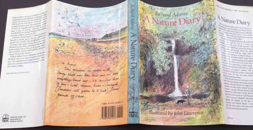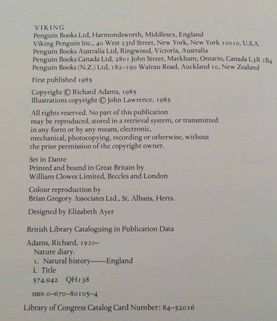 The First UK printing published by Viking / Penguin in 1985.The BOOK is in near FINE condition.A sharp copy free from inscriptions, erasures and markings.The WRAPPER is complete and is in near FINE condition. The wraparound artwork looks very striking in the removable Brodart archival cover.The book has been SIGNED by both Richard Adams and John Lawrence (Illustrator) to the title page. 'This', says Richard Adams of his "Nature Diary," is not a catalogue of rare and seldom seen things, but an authentic day-to-day record made during a calendar year.I simply write down what I saw or heard every day.There is always something to enjoy in nature, even in January or November.' Beautifully illustrated thoughout by John Lawrence - each planned and sketched 'on the spot' in close co-operation with Richard Adams.Wonderful B/W and colour illustrations throughout.A very attractive title and collectible with such attributes.