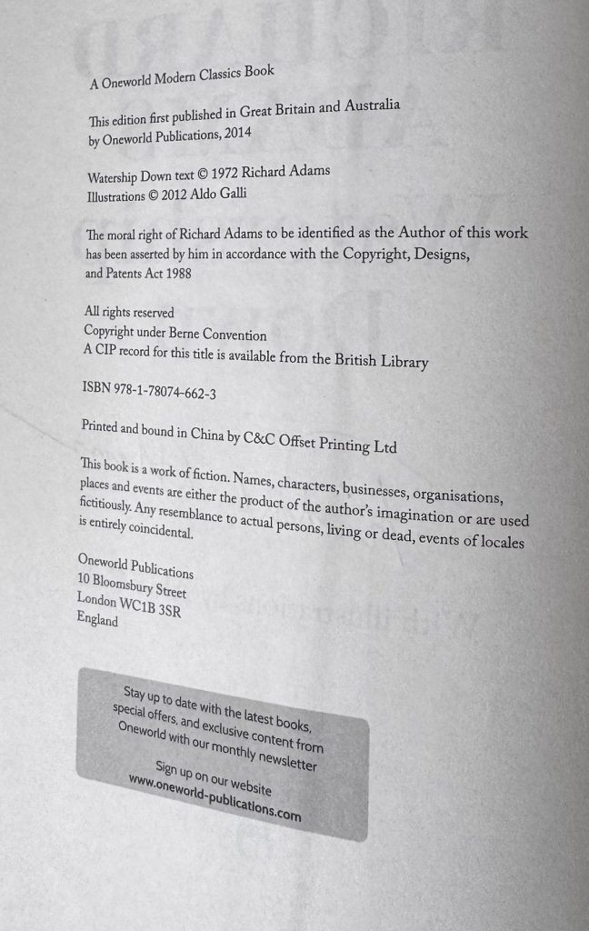 The First UK printing of this illustrated edition published by Oneworld Publications, London in 2014. The BOOK is in near Fine condition and appears unread. The WRAPPER is complete and is in near Fine condition. A Blackwells bookshop small sticker to the lower rear cover and a 'Signed Edition' sticker to the upper front cover. The wrapper is protected in a removable Brodart archival cover. Full page glossy Illustrations in colour throughout by Aldo Galli, who Richard Adams himself selected to illustrate this work. The book has been signed (without dedication) on the title page by Richard Adams not long before his death. Blackwells Bookshop was one of the very few locations where Richard Adams, who was then in his nineties, signed this new edition. The book contains a map, and a new introduction by the author. This was the author's debut novel and it went on to win the annual Carnegie Medal (UK), the annual Guardian Prize (UK), and other book awards. A beautiful production.
