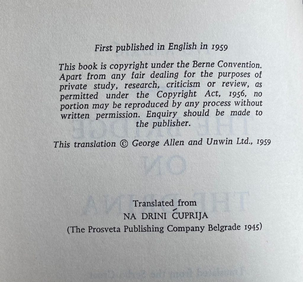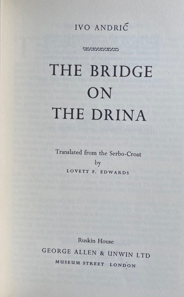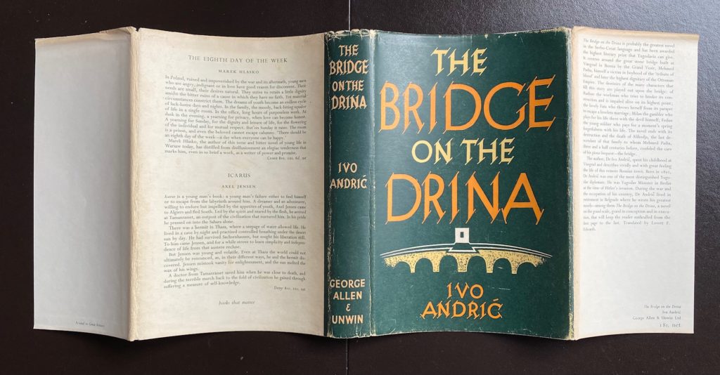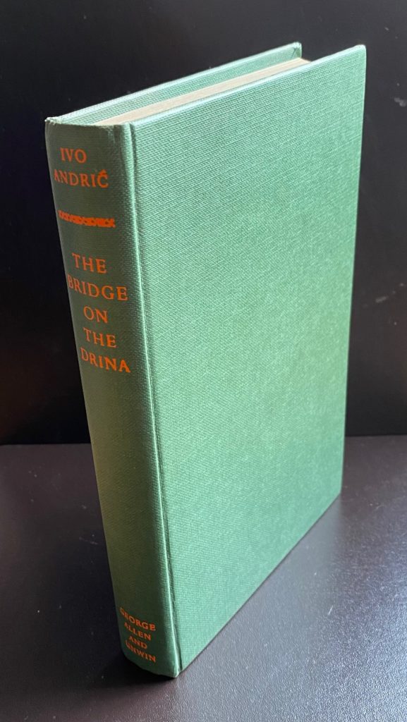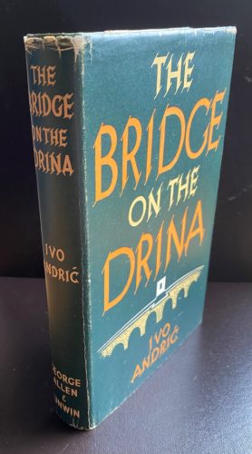 The First UK printing published by George Allen & Unwin, London in 1959. The BOOK is in near Fine condition. Light pushing at the spine ends. Slight toning to the text-block. Free from inscriptions. Some offsetting to the blank end-papers. The WRAPPER is complete and is in near Fine condition. Light edge wear at the spine ends with a little rubbing to the folds. Light toning to the flap edges. Some light toning ( or possibly fading of colouring) to the lettering on the spine. The wrapper looks very striking in the removable Brodart archival cover. This novel which won the author the Nobel Prize for Literature in 1961 is considered a major European work and the best Bosnian novel, covering 350 years of Bosnian history. The first English edition translated from the Serbo-Croat by Lovett F. Edwards. Extremely scarce.