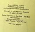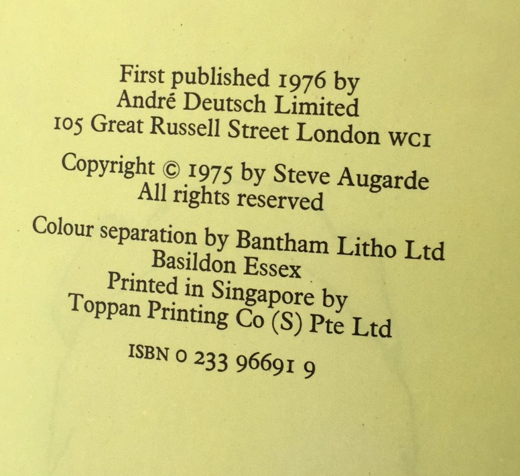 The First UK Printing published by Andre Deutsch in 1976. The BOOK is in near Fine condition. Light spotting to the boards. Free from inscriptions and erasures. Light toning to the text block. The WRAPPER is complete and is in near Fine condition. Light spotting to the edges and a hint of creasing at the spine tips. The pictorial wrapper looks very striking in the removable Brodart archival cover. Full page colour illustrations throughout by the author. The book has been Inscribed and Signed by the Author to the front blank end-paper: ' To Jim and Denise, Good Luck & Best Wishes, from Steve Augarde'. Augarde is the author and illustrator of the 'The Touchstone Trilogy' which is a subtle fantasy that depicts fairy folk as reclusive tribes largely without magic. The first title in the trilogy, 'The Various' won a Smarties award in 2003 and was shortlisted for the Branford Boase Award. All three books of the Touchstone Trilogy have been nominated for the Carnegie Medal.