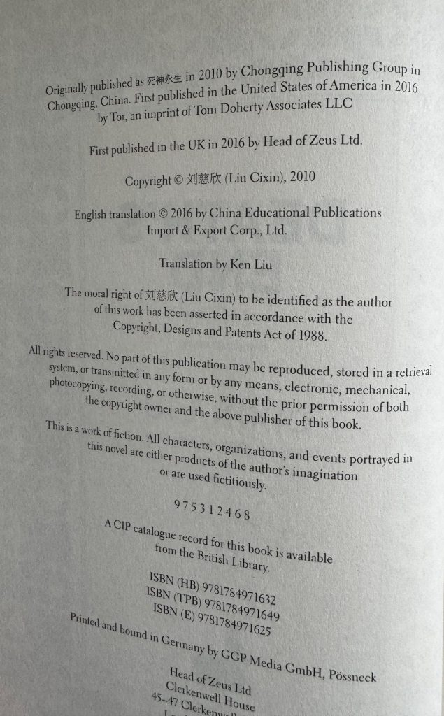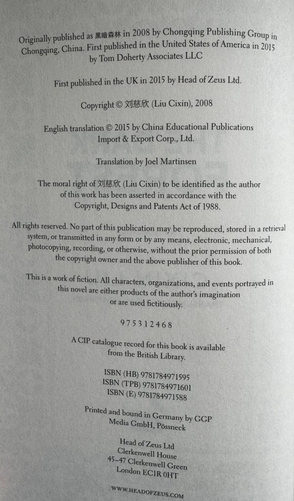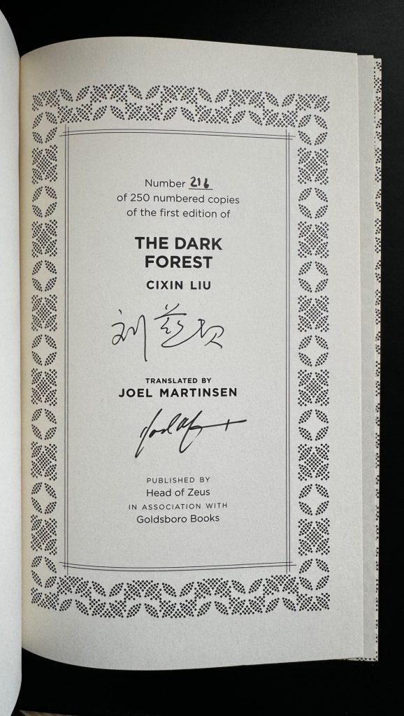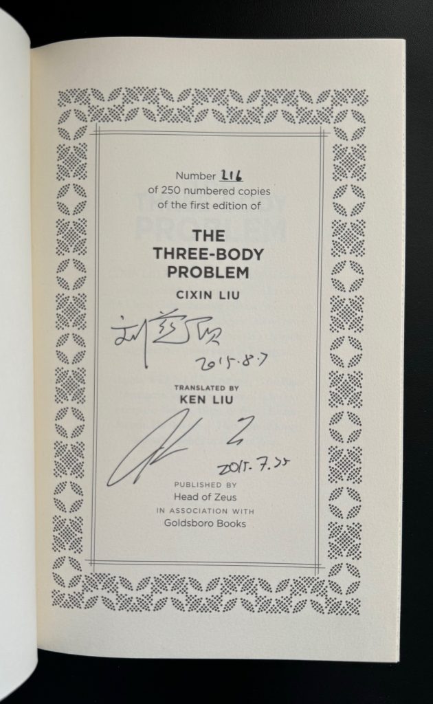 Liu, Cixin ~ ‘The Remembrance of Earth’s Past’ Trilogy :’The Three-Body Problem’, ‘The Dark Forest’, ‘Death’s End’. The Goldsboro Books Limited First Edition Set Signed By Both The Author And Translator