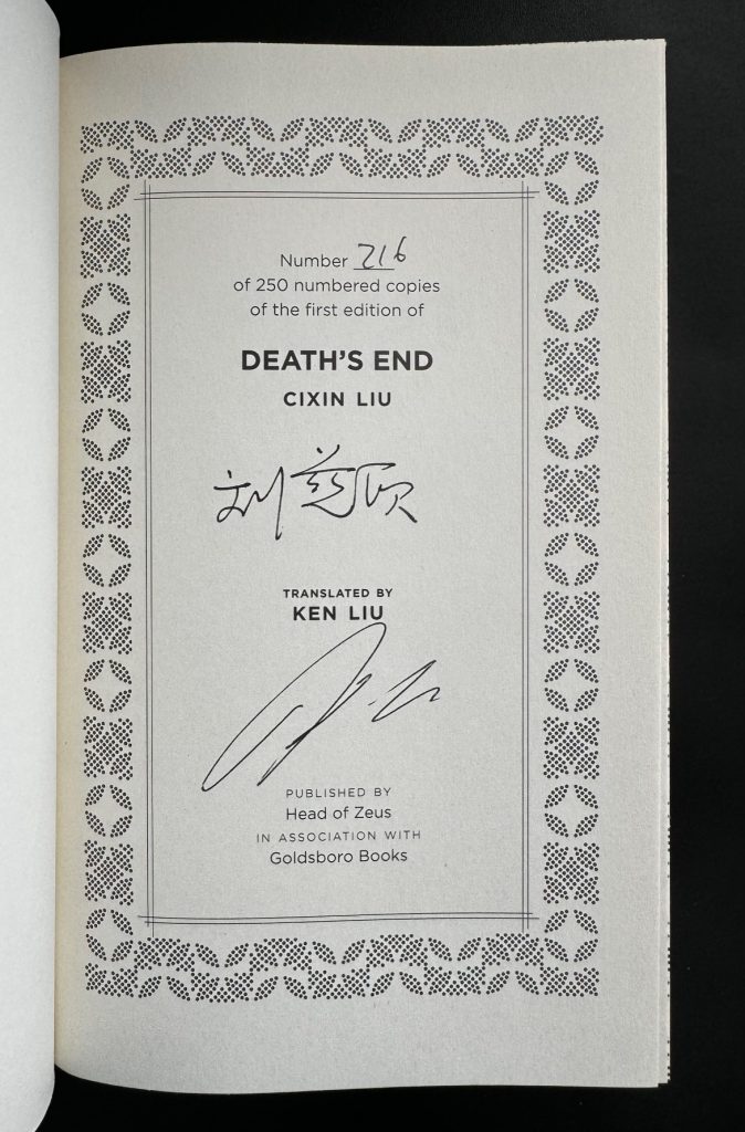 'The Remembrance of Earth's Past' trilogy :'The Three-Body Problem', 'The Dark Forest', 'Death's End'. All three books are the First UK printings published by Head of Zeus, London in Association with Goldsboro Books, London 2015 / 2016. This set is one of the numbered sets of the UK limited edition issued in a an edition of only 250 copies. This set is matching with each copy being number '216' of 250 issued. Each book is signed by Cixin Liu and the translators, Ken Liu ('Three Body Problem', 'Death's End') and Joel Martinson ('The Dark Forest') on the limitation page as called for. The BOOKS are all in near Fine unread condition with just a hint of toning to the upper text-block. The WRAPPERS are complete and are in Fine condition. Each wrapper is protected in a removable Brodart archival cover. 'The Three-Body Problem' was the first novel to win the Hugo Award in translation. It was also nominated for the Nebula Award for Best Novel. 'Death's End' went on to win the Locus Award. "In December 2019, The 'New York Times' cited 'The Three-Body Problem' as having helped to popularise Chinese science fiction internationally, crediting the quality of Ken Liu's English translation, as well as endorsements of the book by George R. R. Martin, Facebook founder Mark Zuckerberg, and former U.S. president Barack Obama. George R. R. Martin wrote a blog about the novel, personally expressing its worthiness of the Hugo Award"(Wiki). Netflix announced in 2020 that 'Game of Thrones' writers David Benioff and D. B. Weiss would be adapting the series into a sci-fi TV drama, making it one of the few originally non-English books adapted by Netflix. This adaptation is about to be launched in March 2024. A world wide selling phenomena already, sales are likely to increase further with the launch of the Netflix adaptation. A very sharp set and highly collectible.