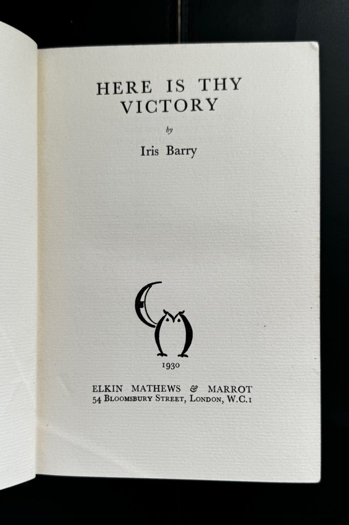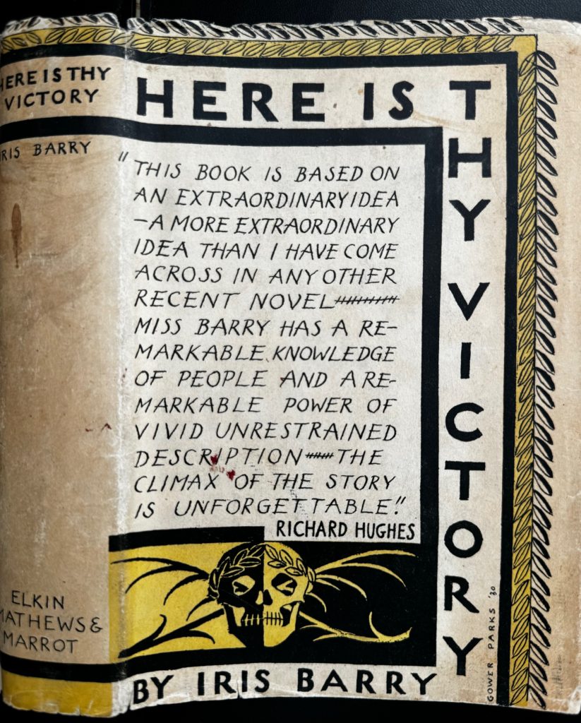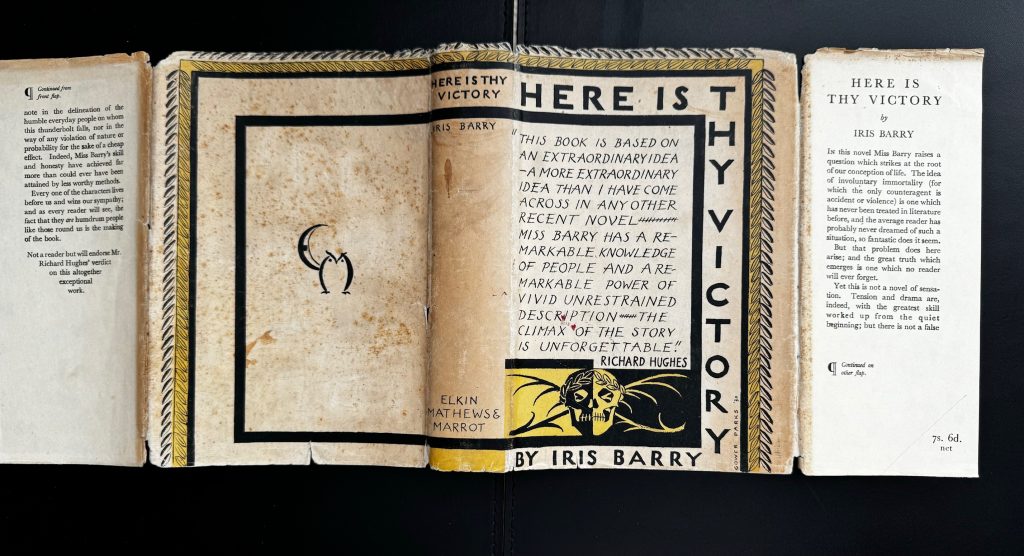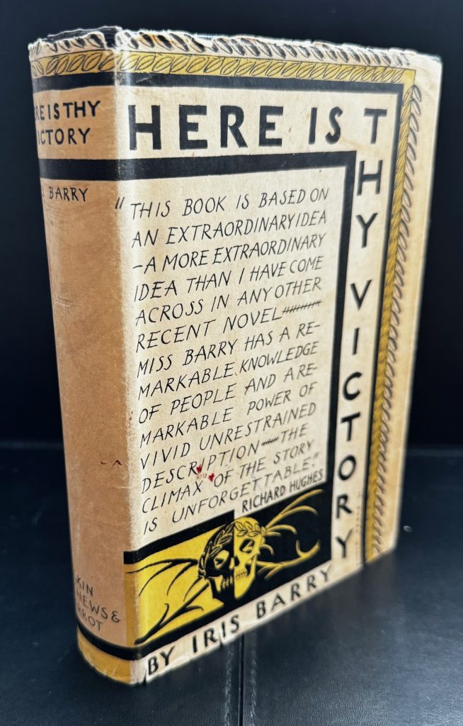 The First UK printing published by Elkin Mathews & Marrot, London in 1930. The BOOK is in near Fine condition. Original publisher's black cloth , with spine lined and lettered in yellow. Light pushing to the spine ends with a small bump to the front upper corner. Light spotting to the text-block and off-setting to the blank end-papers, otherwise internally clean. A very mild vertical crease to the rear blank end-paper. The scarce WRAPPER is complete and is in Very Good++ condition. It is correctly priced '7s. 6d. net' to the lower front flap. Some toning to the spine and panels. Some spotting to the lower panel. Some brown light small stains to the rear panel and spine. Some edge-wear with some small nicks and creasing. A small closed tear to the lower edge fo the rear panel. Small losses at the upper spine and more-so to the corners. The (John) Gower Parks wrapper artwork is very striking in the removable Brodart archival cover. 'Barry, Iris [née Iris Sylvia Symes Crump; married names Porter, Abbott] (1895–1969), writer, film critic, and film curator.... In December 1914 three of her poems were included by Harold Munro in his Poetry and Drama, published under the pen name Iris Barry, which she used for all her writings and by which she was known. These came to the attention of Ezra Pound, and her subsequent correspondence with Pound led to the publication of several of her other poems in the July 1916 issue of Harriet Monroe’s Poetry magazine. ...At the end of the First World War Iris Barry began a relationship with Wyndham Lewis. At times they co-habited, though Lewis would send her away when he wished to be alone. She recalled, ‘My function was to be quiet all day and droll in the evening, to flatter, to listen and to stimulate’ (Iris Barry Papers, Film Study Center, Museum of Modern Art, New York, DOF 03.04). They had two children: Robin Lewis Barry (1919–2002), who was cared for by Iris’s mother in Birmingham, and Maisie Wyndham Lewis (1920–2008), who after being placed in a children’s home was adopted by a couple in Manchester. Following the end of Barry’s relationship with Lewis in 1922, a series of poems titled ‘Shadow Songs’, published in Poetry (September 1922), reflected upon her changed mindset.....Barry’s literary works also reflected a broad set of interests. They included a semi-fictional life of the aristocratic writer and poet, 'Lady Mary Wortley Montagu' (1927), and the speculative fantasy 'Here is Thy Victory' (1930), published first in the United States, in 1929, as 'The Last Enemy'. Both had a mixed reception, one critic accusing her of applying a film technique to novel-writing by focusing too much on minor detail, ‘which borders upon the pernickety’ (English Review, 50, June 1930, 786)... She continued to write, publishing in the New York Herald Tribune, Scribner’s, and the Saturday Review of Literature, as well as translating and editing the 1938 English language version of Robert Brasillach and Maurice Bardèche’s 'History of the Motion Pictures'. Her influential monograph 'D. W. Griffith: American Film Master' was published in 1940. In 1941 she was made a Chevalier of the Légion d’Honneur' (ODNB 9/6/22). Richard Hughes (The author of 'A High Wind In Jamaica') provides a a glowing review of this book on the front of the wrapper. Extremely scarce as the first issue with the correct first issue wrapper. Subsequent editions were issued with a different wrapper design .