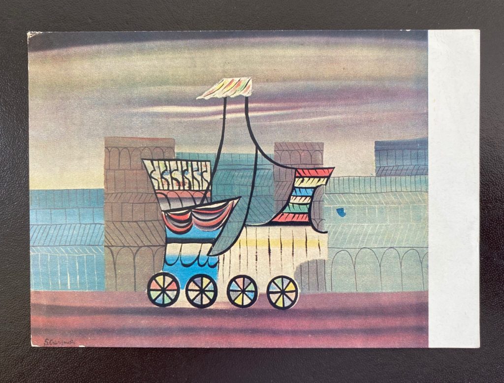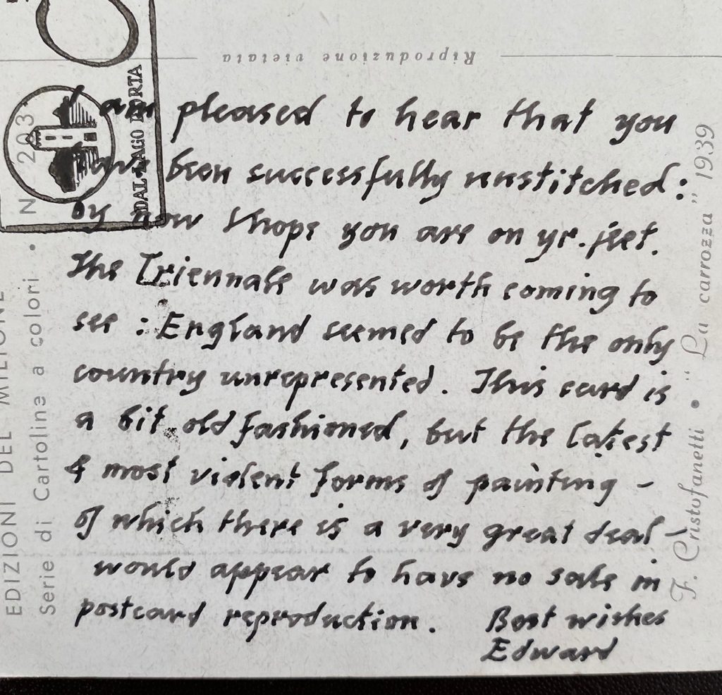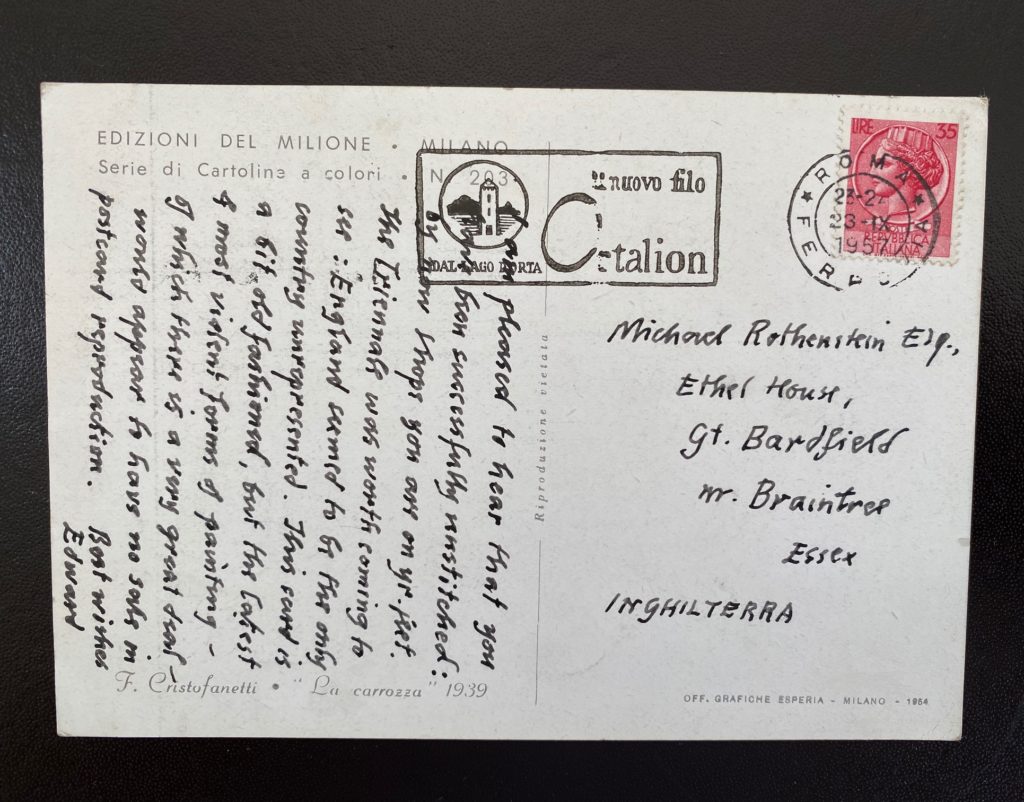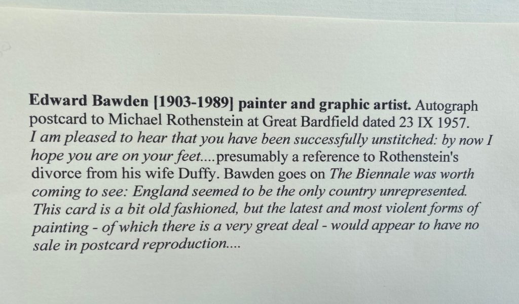 A 15 x 10 cm postcard sent by Edward Bawden from Milan to fellow Bardfield artist Michael Rothenstein. The card is in Very Good++ condition with just a tiny amount of rubbing at the upper corners. Bawden has written on the verso : ‘I am pleased to hear that you have been successfully unstitched: by now I hope you are on your feet'….presumably a reference to Rothenstein’s divorce from his wife Duffy. Bawden goes onto say....'The Biennale was worth coming to see. England seemed to be the only country unrepresented. This card is a bit old fashioned, but the latest and most violent forms of painting - of which there is a very great deal - would appear to have no sale in postcard reproduction, Best wishes Edward‘. An interesting association postcard. The card is protected in a removable archival transparent folder.