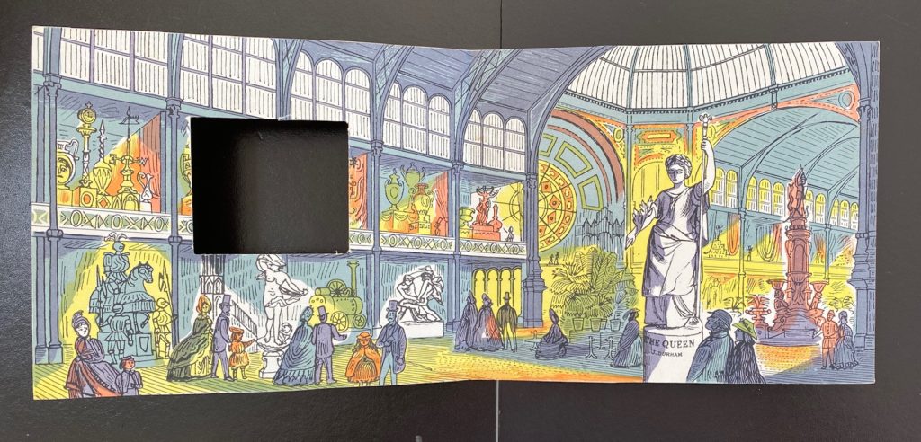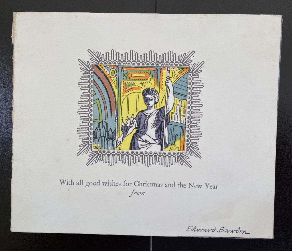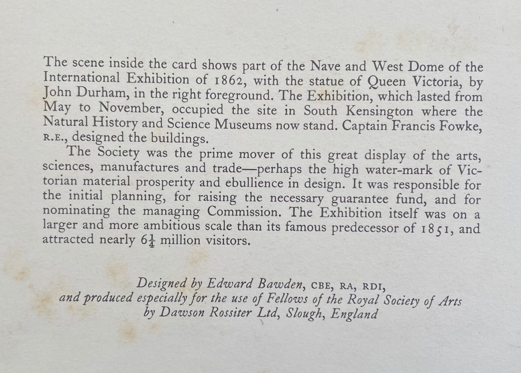 A Christmas card measuring 19 x 16 cm opening out to full coloured design to the verso of the front cover and the recto of the rear cover. Cut out window to the front cover allowing the coloured image of Queen Victoria to be seen from the front. Edward Bawden has signed his name in pencil to the lower front cover. The card is in Very Good++ condition with very slight rubbing to the fold and a hint of spotting to the plain edges. Designed by Edward Bawden and produced by Dawson Rossiter Limited, Slough especially for the use of the 'Fellows of The Royal Society of Arts', marking the centenary of 'The International Exhibition' of 1862, which took place in South Kensington, London. To the verso of the rear cover is some descriptive blurb regarding the interior design and the International Exhibition. Limitation unknown but now a very scarce Christmas Card, more-so signed by Edward Bawden. Protected in a removable archival transparent folder. Collectible.