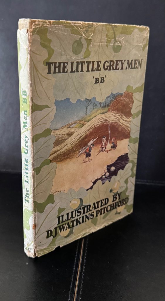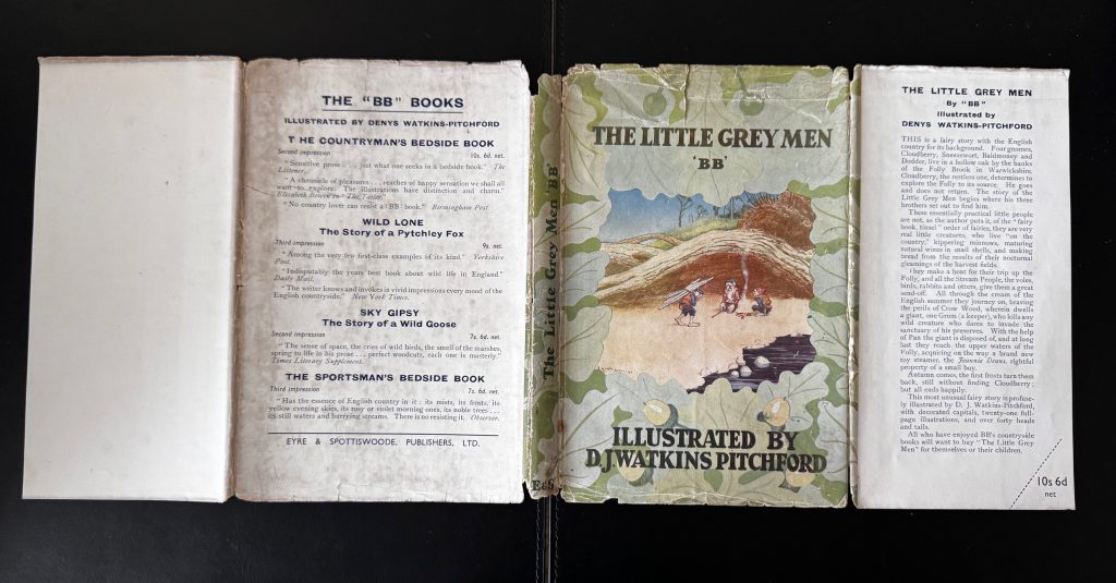 The First UK Printing Published by Eyre and Spottiswoode, London in 1942. 8vo., olive-green boards lettered with titles and decorative oval border in red to upper board; lettered in red to backstrip; in the original unclipped pictorial wrapper showing an image of three gnomes around a campfire; captioned frontis, along with numerous other striking black and white illustrations throughout, including headpieces, tailpieces, decorative initials, full-page captioned illustrations, and one page of sheet music showing ‘The Folly Brook Song’, with music by Walter Pitchford, towards the end of the text; The BOOK a Very Good+ copy, lightly sunned at backstrip with minor pushing to spine tips; edges and endpapers a little spotted; one or two more spots sporadically throughout; first few pages lightly creased; contemporary ownership inscription in blue ink to the front free endpaper; the Good+ WRAPPER rubbed along folds, with chips at edges, particularly the ends of folds and one or two larger to the spine ends, with some loss of colour; rubbed and creased with some closed tears (longest 3cm); beginning to split along spine, but otherwise unrestored and in original condition. The wrapper is protected in a removable Brodart archival cover. First edition, correct first issue of BB’s most famous work. A cheap production printed to War Economy Standards. A scarce survivor more-so with the wrapper present. The Little Grey Men was BB’s sixth published work, but remains his best-loved. It is the story of three gnomes, imaginatively named Sneezewort, Baldmoney and Dodder, who set out in search of their missing brother, Cloudberry (lost in his search for the source of Folly Brook). Aboard their boat, they travel the length of the stream, braving such perils along the way as Grum, the giant, who kills anyone who dares invade the sanctuary of his preserves. Denys Watkins-Pitchford was born in the Northamptonshire Village of Lamport in 1905 but, unlike his twin brother Roger, was educated at home due to a series of health issues. It was during his early years that he had an experience which was to shape the rest of his life: at the age of four, one a bright summer day, he looked out of his nursery window to see, incontrovertibly, a gnome in his garden. From that day forward he maintained a belief in the “little people”, and it was this which inspired The Little Grey Men, which was published when he was 36 years old. After studying at the Northampton School of Art, he won a travelling scholarship to Paris, and afterwards taught Art at Rugby School before devoting himself full-time to his art and writing. In all, he wrote some 60 books over the course of his life, and illustrated more than 30 others. His books are characterised by the inclusion of the following lines, taken from a Cumbrian Gravestone, here found as an afterword to the last page: For The Little Grey Men, Watkins-Pitchford won the Carnegie Medal in the year of publication. “Warwickshire is one of the last English counties where one might meet with a fairy; surely William Shakespeare knew this when he wrote A Midsummer Night’s Dream.”