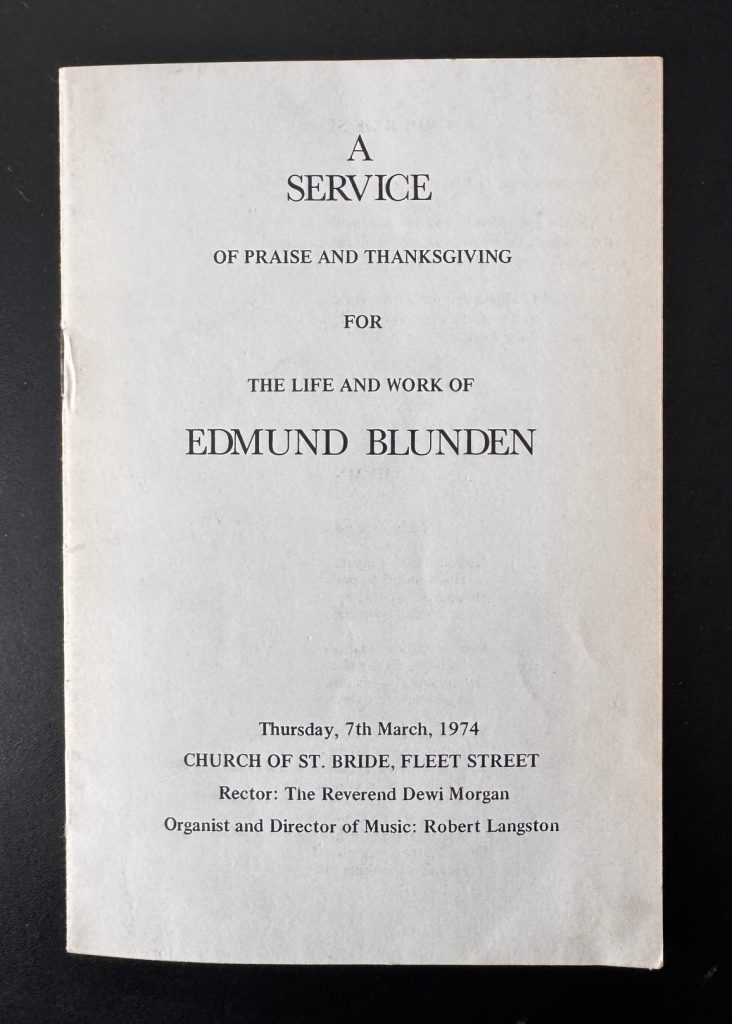 The First UK Printing published by Cobden-Sanderson, London in 1928. The BOOK is in near Fine condition with a little toning and spotting to the text-block. Light spotting to the prelims. Bookplates of bibliophile and author Simon and Judith Nowell-Smith to the front pastedown. The WRAPPER is complete and is in near Fine condition. Some light edge-wear and creasing at the spine ends and corners. Mild toning to the spine. The wrapper is protected in a removable Brodart archival cover. Signed presentation copy from the author to his fellow ‘trench stove’ and friend Warwick R. Redway. They served together in WW1 and Redway is referred to twice in the book as ‘R’( pages 79 & 84). Blunden has also written out the poem ‘Escape’ to the FEP which appears on page 273 of the book. Underneath the poem, he has written ‘to his old friend and fellow trench stove, W.R. Redway’s book, March 26, 1933’. Loosely inserted is an ALS dated 1930 ( with the original H/W envelope) from Blunden to Redway, which starts ‘This is the 14th year since your delightful lapse from the path of slaughter at Givenchy….’. Additionally loosely inserted is the publisher’s flyer for this title, with reviews by J.B Priestley, R.H. Mottram, Arnold Bennett et al. With The Order of Service For ' A Service Of Praise And Thanksgiving For The Life And Work Of Edward Blunden'. The service took place on &th March 1974 At the Church of St Bride, Fleet Street, London. The 8 page booklet is in Very Good++ condition. The poet John Betjeman read a lesson and Rupert Hart-Davis gave the address. An important association copy.