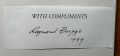 The First UK Printing published by Hamish Hamilton in 1984. The scarce Hardback format with laminated coloured boards. No Wrapper as issued. The BOOK is in near Fine condition. Free from inscriptions and erasures. Light bumping at the spine ends with a few very tiny rubs in places to the boards. Profusely illustrated in colour throughout by the author. Tipped-in to the front end-paper is a compliments slip signed by Raymond Briggs and dated 1999. Scarce.