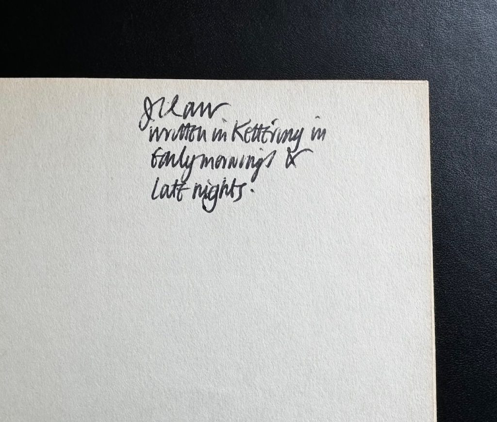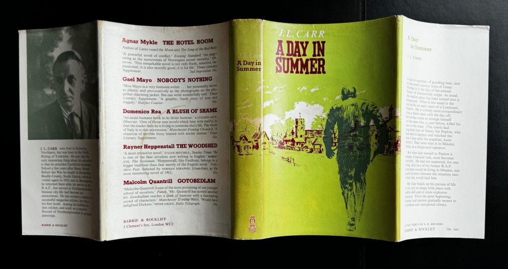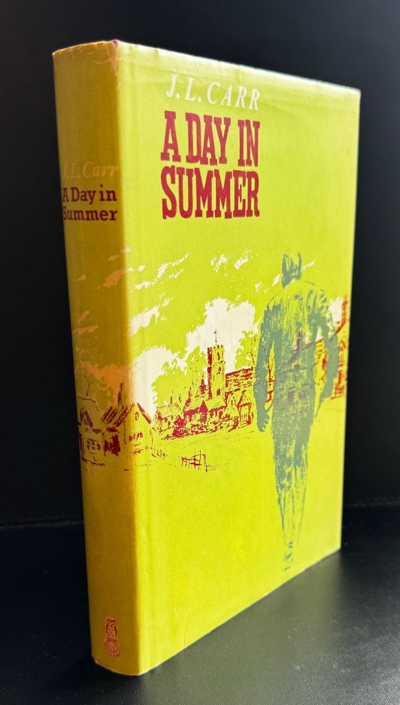8vo., titles in white to spine separated by star devices; publisher’s own device to foot; complete in the original unclipped pictorial dust jacket designed by S. R. Boldero (18s. net); with photograph of the author to the lower flap; THE BOOK essentially a near Fine copy, a little pushed to foot of spine; in the Very Good++ WRAPPER lightly creased to edges; a little darkened and rubbed along spine, particularly at the head; some light shelf wear to the lower panel with a minor cup stain affecting the lower portion. The wrapper is protected in a removable Brodart archival cover. First edition of the author’s first book, this copy inscribed by Carr to the front free endpaper: “J. L. Carr, written in Kettering in early mornings and late nights”. The reference is to his working in teaching at the time of writing. Carr began teaching in 1930 as a supernumerary teacher at South Milford Primary School in Yorkshire, before training at Dudley college and further teaching stints in Hampshire, Birmingham, and even South Dakota. After travelling to Japan, China and Malaya (now Malaysia), he joined the RAF and served in the war predominantly in West Africa. In 1943, he was commissioned as an intelligence officer at RAF bases in Kent, Norfolk and Scotland, and it was these experiences which predominantly influenced the subject of A Day in Summer. It was after the war, when he had married and moved to Kettering, that he began writing the novel, in between long hours as headmaster of Highfields Primary School in Kettering. In what can be seen as a semi-autobiographical work, the plot follows Peplow, a mild-mannered bank clerk and RAF veteran who arrives in the fictional village of Great Minden seeking retribution for the death of his son. Armed with a hidden service revolver, he seeks to track down the fairground ruffian who he believes mowed down his ten year old son. One reviewer writes that the debut work contains “an amused, sympathetic fascination with small, self-contained communities; the inability of men and women to understand each other; the unnerving backwash of memory experienced by those who have fought in a war; the decline of organized religion in the face of an indifferent world; and the way in which the past can enmesh us”. (Ursula Buchan, Slightly Foxed). In 1989 the book was adapted into film, starring John Sessions and Ian Carmichael, among others. Rare indeed with these attributes.