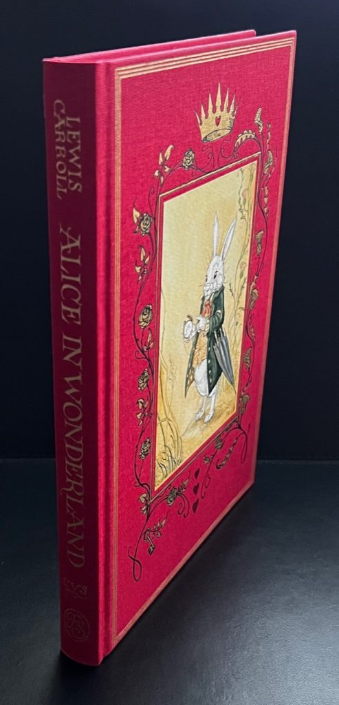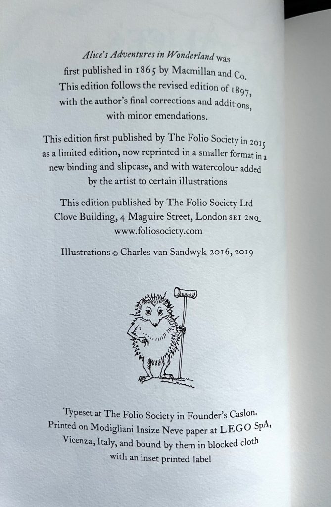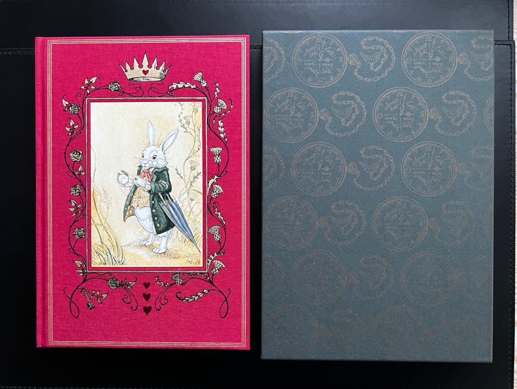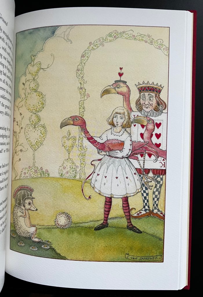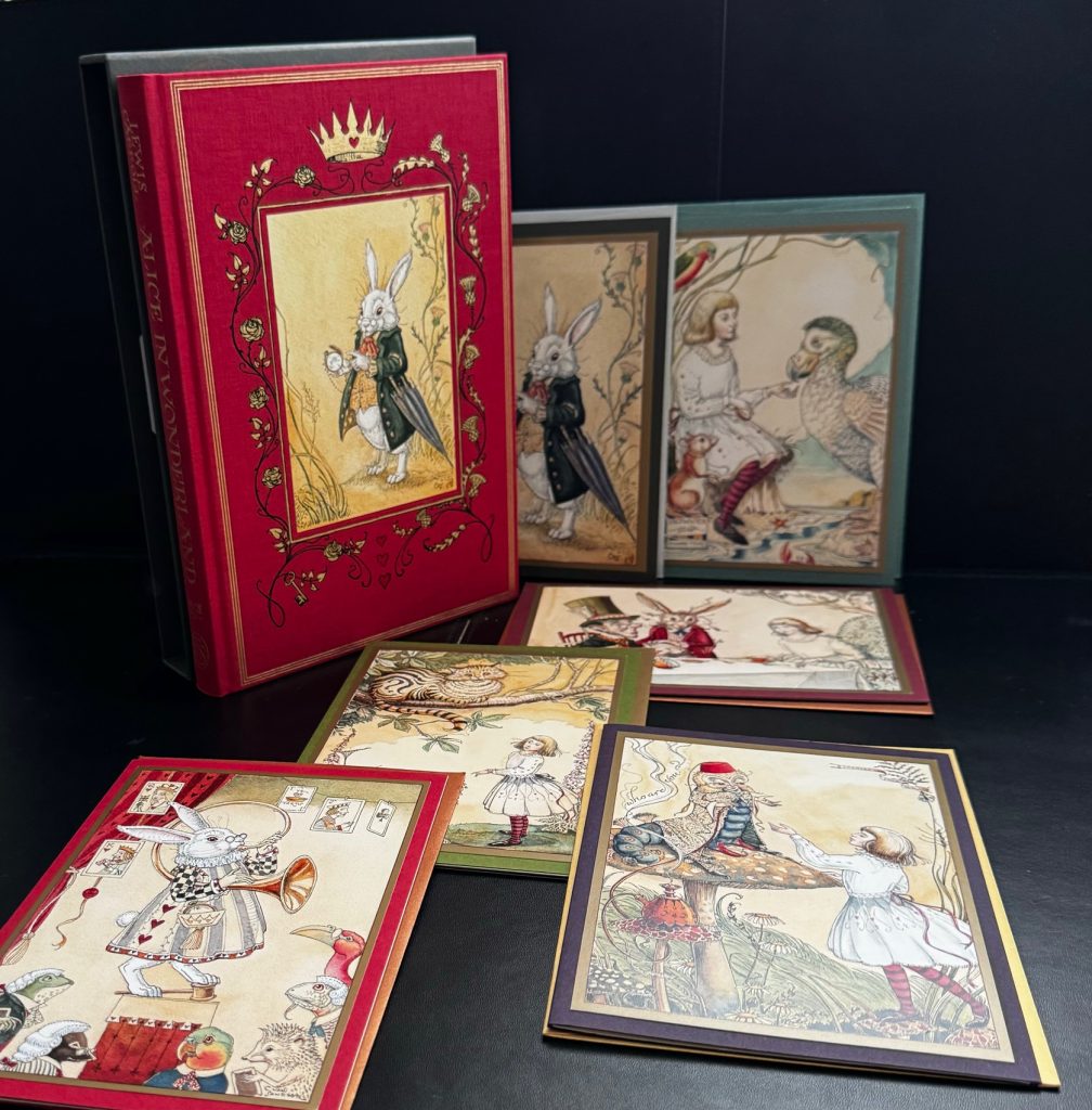 The First UK Trade printing published by The Folio Society, London in 2019. The BOOK is in Fine condition. Fully bound in red-cloth with floral gilt and Wonderland-themed decorations with inset colour litho of the White Rabbit and gilt spine titles. Endpaper maps of Wonderland, new to this edition. This is a reprint of the 2015 Special Limited Edition, now in a smaller format with a a new binding and slipcase, with watercolour added by the artist Charles van Sandwyk, to certain illustrations, and with an additional illustration. Full-page colour frontispiece, with 13 additional full-page colour plates and illustrations, as well as 2 double-page colour spreads. Signed (without dedication) by the illustrator to the half-title. Together with a complete limited set of six greeting cards reproduced from the original watercolour paintings in this edition, with their original envelopes. The cards and envelopes are all in Fine unused condition. Each card has a coloured image on the front and inside 4 pages on which there are B/W illustrations across 2-3 pages. This is a complete set of the six cards that were issued in a limited edition and also un-signed. Each card has been signed (without dedication) by the illustrator. These cards are now very scarce and collectible in their own right. A very handsome production and increasingly scarce with such attributes.