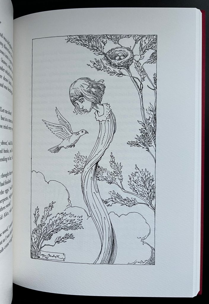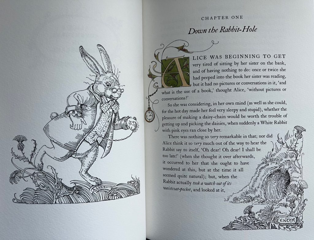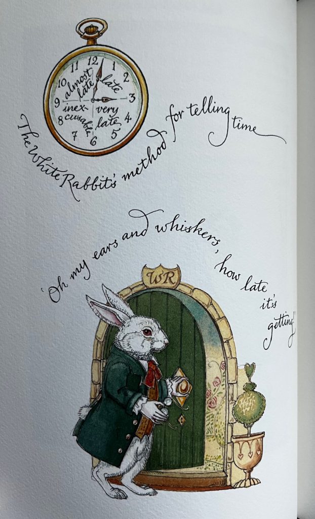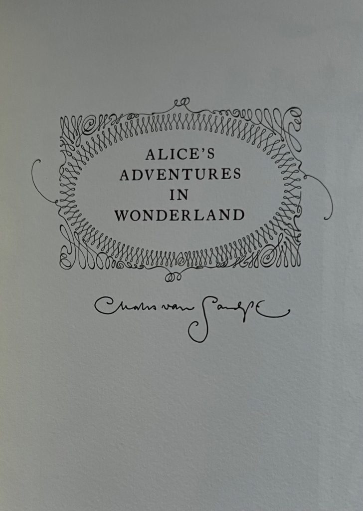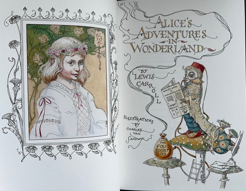 The First UK Trade printing published by The Folio Society, London in 2019. The BOOK is in Fine condition. Fully bound in red-cloth with floral gilt and Wonderland-themed decorations with inset colour litho of the White Rabbit and gilt spine titles. Endpaper maps of Wonderland, new to this edition. This is a reprint of the 2015 Special Limited Edition, now in a smaller format with a a new binding and slipcase, with watercolour added by the artist Charles van Sandwyk, to certain illustrations, and with an additional illustration. Full-page colour frontispiece, with 13 additional full-page colour plates and illustrations, as well as 2 double-page colour spreads. Signed (without dedication) by the illustrator to the half-title. Together with a complete limited set of six greeting cards reproduced from the original watercolour paintings in this edition, with their original envelopes. The cards and envelopes are all in Fine unused condition. Each card has a coloured image on the front and inside 4 pages on which there are B/W illustrations across 2-3 pages. This is a complete set of the six cards that were issued in a limited edition and also un-signed. Each card has been signed (without dedication) by the illustrator. These cards are now very scarce and collectible in their own right. A very handsome production and increasingly scarce with such attributes.