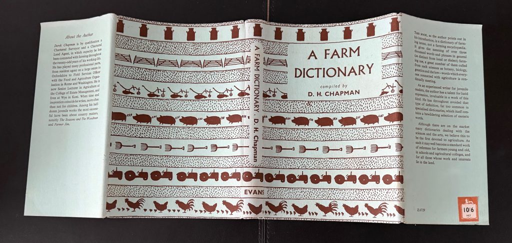 The Sole UK Printing published in association with The National Federation of Young Farmers' Clubs by Evans Brothers, Limited, London in 1953. 8vo., publisher's green boards, lettered in gilt to spine; in the unclipped publisher's blue wrapper, printed with tessellating farm images in brown; illustrated with pictures and diagrams in text throughout, all by Evelyn Dunbar; The BOOK with two small tape remnant marks to the upper board; lightly sunned at edges and bumped at spine tips; Very light residual tape marking to the endpapers; and some light toning and sporadic spotting, mostly to the outer-edge of the text block; still a very clean copy; The WRAPPER is in Very Good++ or better condition and rarely found as such, retaining almost all of its original brightness, with an overlaid price sticker of 10/6 net to the front flap, a closed tear to the front flap now expertly repaired internally with archival tissue; a couple of very tiny nicks; some tape residue marks visible to the verso only. The wrapper is protected in a removable Brodart archival cover. First UK edition of this compendium of farm terms by Chapman, himself a charterer surveyor and land agent who had previously been employed on a large estate in Oxfordshire, as well as with the Food and Agriculture Organisation in Rome and Washington. At the time of writing, Chapman was a senior lecturer in Agriculture at the College of Estate Management, and he had also written a series of books for children on the subject of the English countryside. This makes the tone of the present work, which was intended for the lay-person, as rather conversational in tone, and "for all those whose work and interests lie in the land". The text is greatly enhanced by the illustrative captioned drawings and diagrams, which have been provided by Evelyn Dunbar, the British artist and illustrator best known for recording the work of the Women's Land Army during the war. She was also commissioned for magazines such as Country Life, and other farming works including 'A Book of Farmcraft' by Michael Greenhill (1942), which was intended for those who had little prior knowledge of farming. A very elusive title in such condition.