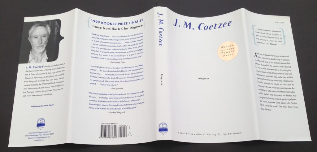 The First USA printing published by Viking, New York in 1999. 8vo., white cloth-backed white boards, spine lettered in metallic blue; in the matching white and blue wrapper (unclipped, priced $23.95 to front flap), designed by Martin Ogolter. The BOOK mildly bumped at spine ends, else near Fine; The WRAPPER also Fine, with circular gold Booker Prize Winner sticker to the front panel. The wrapper is protected in a removable Brodart archival cover. First US edition, first printing, stated, with full number line 1-10. This copy signed (without dedication) by the author in blue ink to the title page. A copy of the ticket for the signing event is loosely laid in for provenance. The Booker Prize winning novel from the Nobel Prize-winning author. A deeply questioning and uncomfortable novel, 'Disgrace' tells the story of David Lurie, a middle-aged and divorced scholar who retreats to his daughter's smallholding after an affair with a younger student. Set against the backdrop of post-Apartheid South Africa, the book explores complex political, racial, and personal issues, and was described by one Guardian article as 'intensely human, rooted in common experience and replete with failure, doubt and frustration.''Disgrace' was the second work for which the author was awarded the Booker Prize. The first was in 1983, with 'Life & Times of Michael K'. Until 2001, when Peter Carey won his second Booker Prize for the 'True History of the Kelly Gang', Coetzee was the only author to have been awarded the prestigious prize twice. "The irony does not escape him: that the one who comes to teach learns the keenest of lessons, while those who come to learn learn nothing." A fine copy.