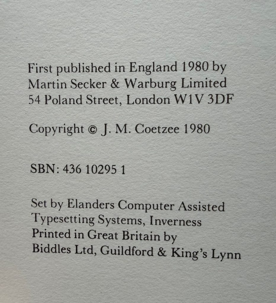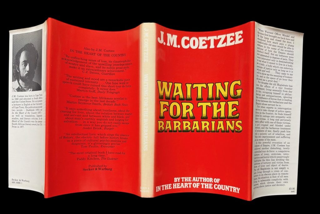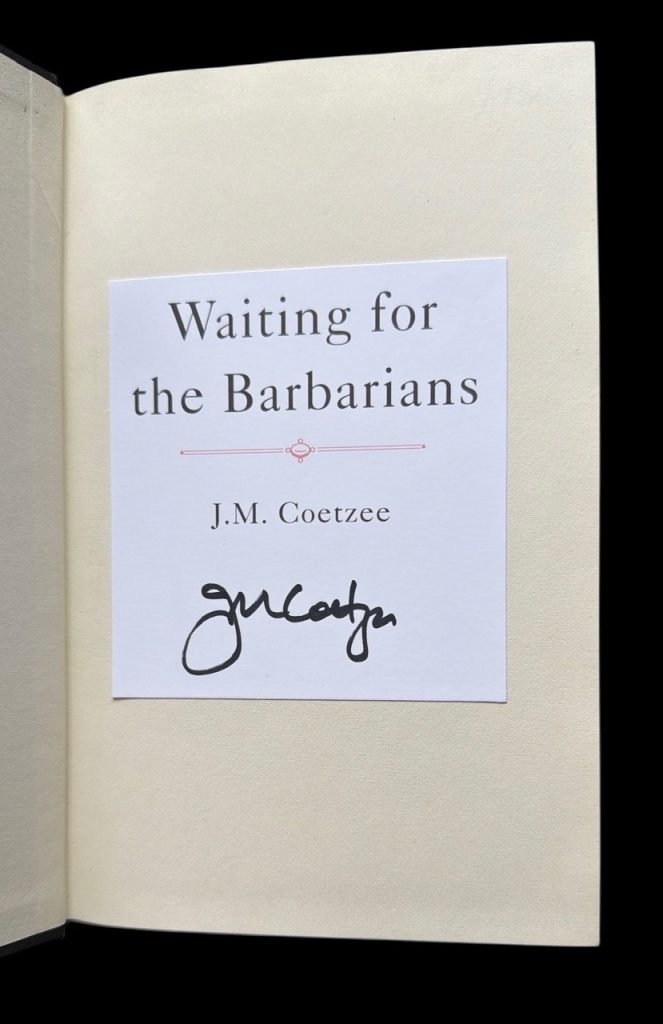 The First UK Printing published by Secker & Warburg, London in 1980. 8vo., black publisher's boards, lined and lettered in gilt to the spine; together in the original unclipped wrapper (£5.95) printed in red, white, yellow and black; The BOOK is essentially near fine, with a couple of tiny white specks to the boards; The WRAPPER is in Very Good condition with fading of the red colouring to the spine, as is usually encountered but the white lettering is still legible. The wrapper is protected in a removable Brodart archival cover. Signed by the author to a tipped-in bookplate to the front blank end-paper. This signed bookplate was provided by The Oak Tree Fine Press. 'J M Coetzee was instrumental in establishing Oak Tree Fine Press and has generously signed many books to assist our efforts. The provenance of the signature is thus guaranteed' (Oak Tree Fine Press). The third novel by the South African writer John Maxwell Coetzee, heavily influenced by the 1904 poem of the same name by the Greek poet Constantine P. Cavafy. In the poem, a small, struggling principality waits for the 'The Barbarians', whose arrival heralds both destruction and salvation. In Coetzee's adaptation, the plot is centred around the magistrate of an imperial outpost in an unnamed wilderness (though closely resembling South Africa). Having served his empire for most of his life, he finds himself drawn into sympathy with the very victims of the regime he has enforced for most of his life, leading to his rebellion, imprisonment, and ultimately suffering as an enemy of the state. Many of Coetzee's published works are semi-autobiographical, and several of his characters have been viewed as such; figments of his personality or otherwise alter egos such as Elizabeth Costello, a recurring character which appears in several of his books. Here, comparisons have been drawn between the introspective, academic magistrate and the author himself. The book was later adapted into an opera by Philip Glass, which premiered on September 10, 2005, at the Theater of Erfurt, Germany, under the direction of Guy Montavon. It was also adapted into film in 2019, starring Johnny Depp, Robert Pattinson, and Mark Rylance as The Magistrate. Coetzee was the first writer to be awarded the Booker Prize twice - in 1983 for 'Life & Times of Michael K', and for 'Disgrace' in 1999. This book precedes both, and is a scarce example of his early output. ''Mr. Coetzee sees the heart of darkness in all societies", Bernard Levin later wrote, "and gradually it becomes clear that he is not dealing in politics at all, but inquiring into the nature of the beast that lurks within each of us.''