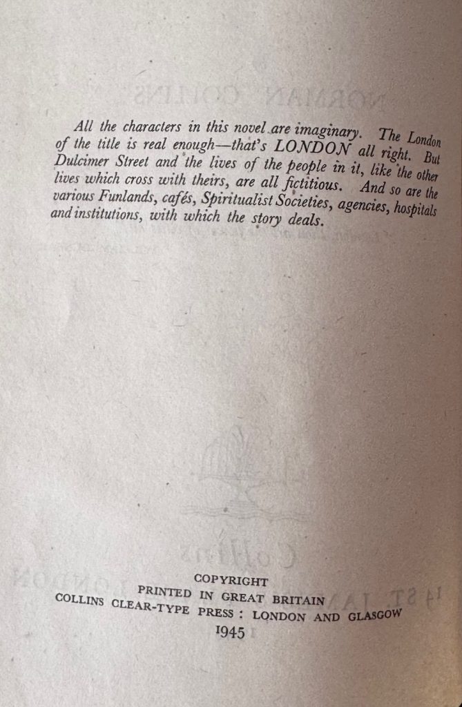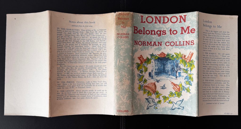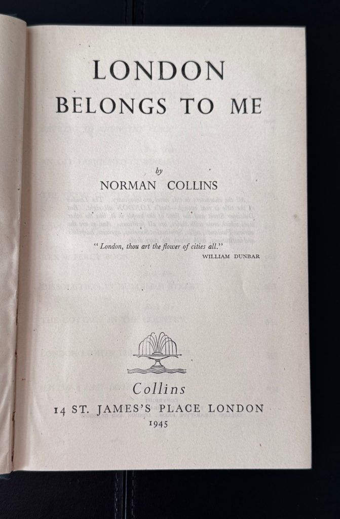 The First UK printing published by Collins, London in 1945. 8vo., dark green cloth lettered in paler green to backstrip; together in the original unclipped pictorial wrapper (12s. 6d. net) showing a street scene surrounded by an ivy leaf garland and London landmarks; The BOOK is an excellent copy, clean and square with a little darkening to the upper edge and a few light spots to the prelims, else near Fine; The WRAPPER is in Very Good++ condition, with a little light spotting and the spine darkened to one small patch at the head where there is also a little associated rubbing, nicking and some very light chipping. A very nice example. The wrapper is protected in a removable Brodart archival cover. Norman Richard Collins (1907–1982) began his career at the Oxford University Press before working for the 'London News Chronicle' and later as literary editor at the 'Daily Mail'. At the age of 27 he joined Victor Gollancz publishers, where he became deputy chairman, before joining BBC radio. His most important contribution came after the war, when he was appointed as controller of the 'Light Programme', which had grown from the British Armed Forces entertainment services during the war. He was also one of the creative forces behind 'Women's Hour', the hugely popular broadcast which still runs today. 'London Belongs to Me' is Collins's best-known work, and tells the story of a group of characters living in the boarding house of 10 Dulcimer Street, including a widowed spiritualist landlady, a former actress, a young mechanic, and Mr Puddy, who is overly fond of tinned food. Described by many as a modern Dickensian tale, the book was inspired by Collins's own experiences during the formative years of the war, and features weddings, boxing matches, seances and Nazi spies, all rolled into one. In 1948 the book was adapted into a successful film starring Richard Attenborough and Alastair Sim. "One of the great city novels" wrote novelist Sarah Waters, "a sprawling celebration of the comedy, the savagery, the eccentricity and the quiet heroism at the heart of London life." While copies of the Book Society edition are more commonly found, the true first trade edition is very scarce in such condition.