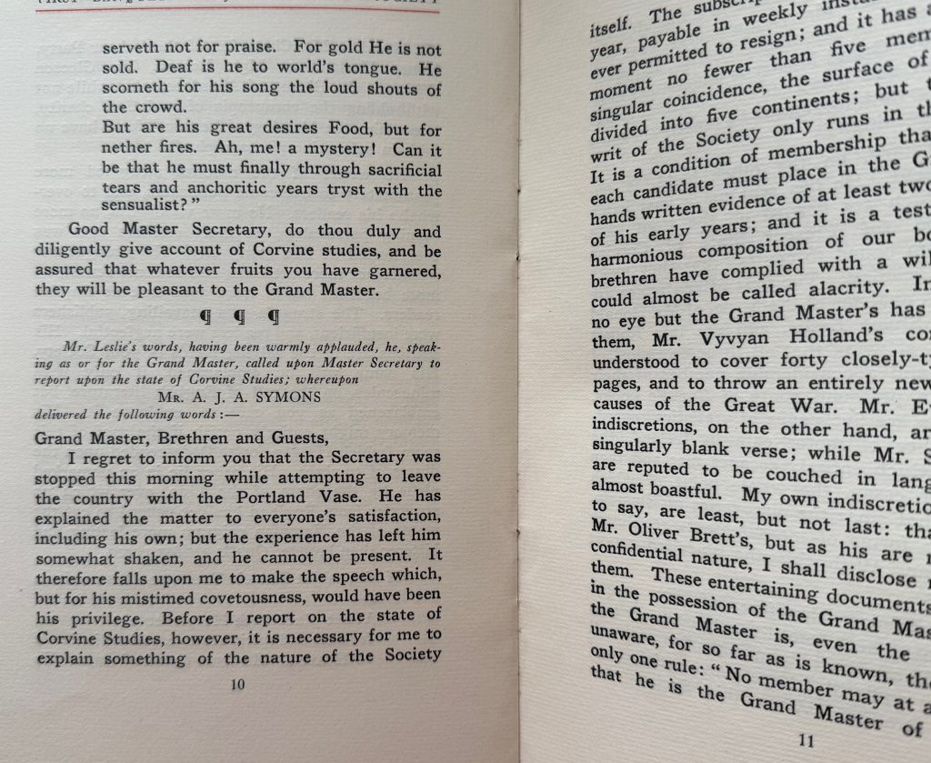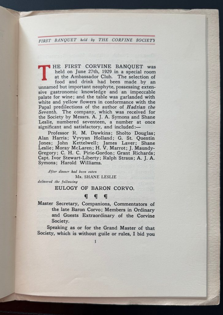 The sole UK printing privately printed ( A J Symons?), London in 1929. The OOK is in Very Good++ or better condition. Original cream printed wrappers. Spine and edges faintly browned, otherwise very clean internally . An extraordinary document recorded by A.J.A. Symons and giving an account of a eulogy in Corvo’s honour by Shane Leslie, a report on the arcane and absurd practices of the society and a speech by C.H.C. Pirie-Gordon. Also an eight course menu of the dinner with accompanying wines. These included caviare, lobster, chilled consommé, stuffed duck, cold chicken and three desserts all washed down with vodka, sherry, Montrachet 1916, Chambertin 1915, Krug, Chateau d’Yquem 1906, Croft’s 1904 and Courvoisier 1811. These were taken copiously as Symons observes that “the meeting did not so much end as deliquesce.” Rare. *OCLC* locates only a single copy.