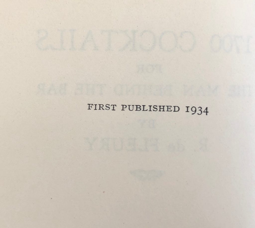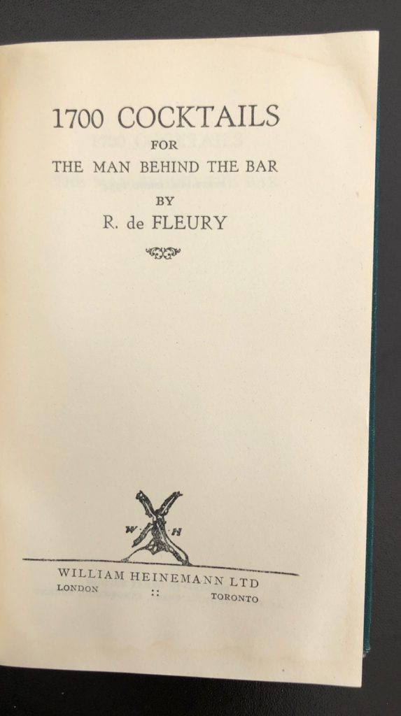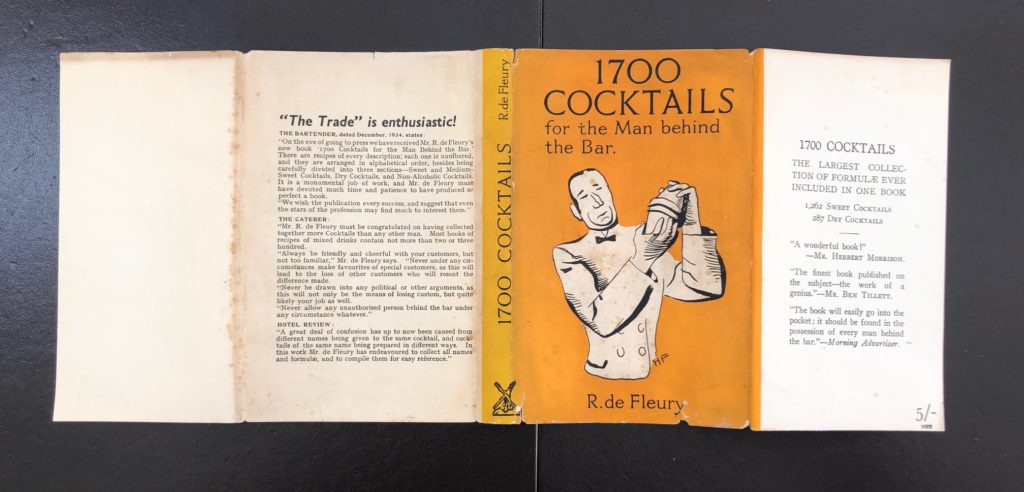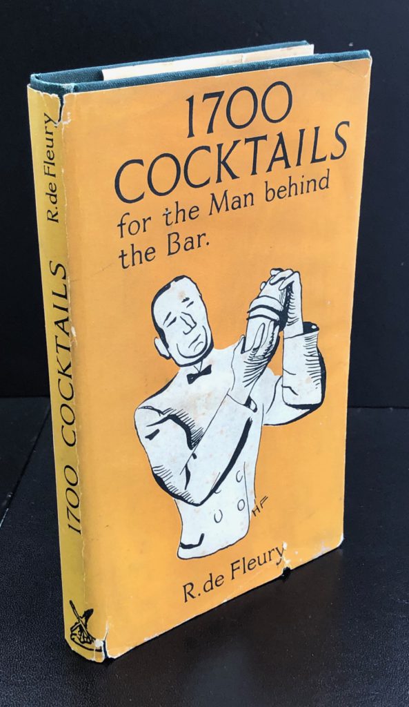 The First UK printing published by William Heinemann Ltd, London In 1934. The BOOK is in Very Good++ or better condition. Slight splaying of the boards. The gilt titling remains very bright. Light offsetting to the end papers. Mild toning to the text-block and page edges. Free from inscriptions. Light crease to the upper corner of the first 30 pages. The WRAPPER is complete and is in Very Good++ condition. A little edge wear with some small closed tears and light rubbing in places. A small chip to the lower front cover edge. Light fading of colouring to the spine. Mild age related markings to the flaps and covers. The wrapper is protected in a removable Brodart archival cover. A very scarce British cocktail guide in which the front flap states: 'The largest collection of formulae ever included in one book. 1,262 Sweet Cocktails, 287 Dry Cocktails'. De Fleury would go on to publish only one other guide in which he added 100 cocktails to this collection. A very attractive copy of a title which rarely turns up in collectible condition.
