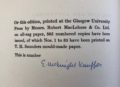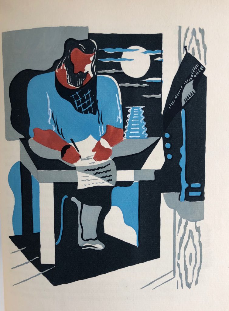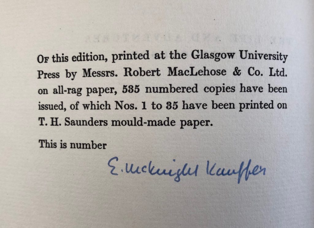 The First UK printing of this illustrated edition published by Frederick Etchells & Hugh Macdonald, London in 1929. The BOOK is in Very Good++ or better condition. The limited issue of only 35 copies which have been signed by Kauffer to the limitation page, this one unnumbered. Printed on T. H. Saunders mould-made paper, and bound in quarter morocco. There was also a trade edition of 500 copies unsigned on normal rag paper and bound in cloth. Original blue quarter morocco, titles to spine silver, blue buckram boards with Kauffer's design in silver to the front board, edges untrimmed. The morocco spine is slightly sunned and rubbed. Internally, apart from some offsetting to the endpapers, the book is clean and the binding remains tight. Frontispiece and 7 hand coloured pochoir illustrations by E. McKnight Kauffer, using the pochoir process. This deluxe signed issue is extremely rare, with only two copies recorded at auction in the past 50 years. Kauffer was born in the U.S.A. but settled in England in 1914. He was a member of both Wyndham Lewis's 'Group X' and the' Cumberland Market Group'. Kauffer's real genius was in advertising art; he produced seminal posters for the London Transport Board and for the Great Western Railway, as well as book jackets and illustrations. A very attractive production. The Times described McKnight Kauffer's illustrations as 'these very fresh and brilliant plates' while T.S. Eliot, an early collaborator, wrote 'I like the illustrations immensely, and some them have a quality which reminds me of Chirico'. (Tucker 26).