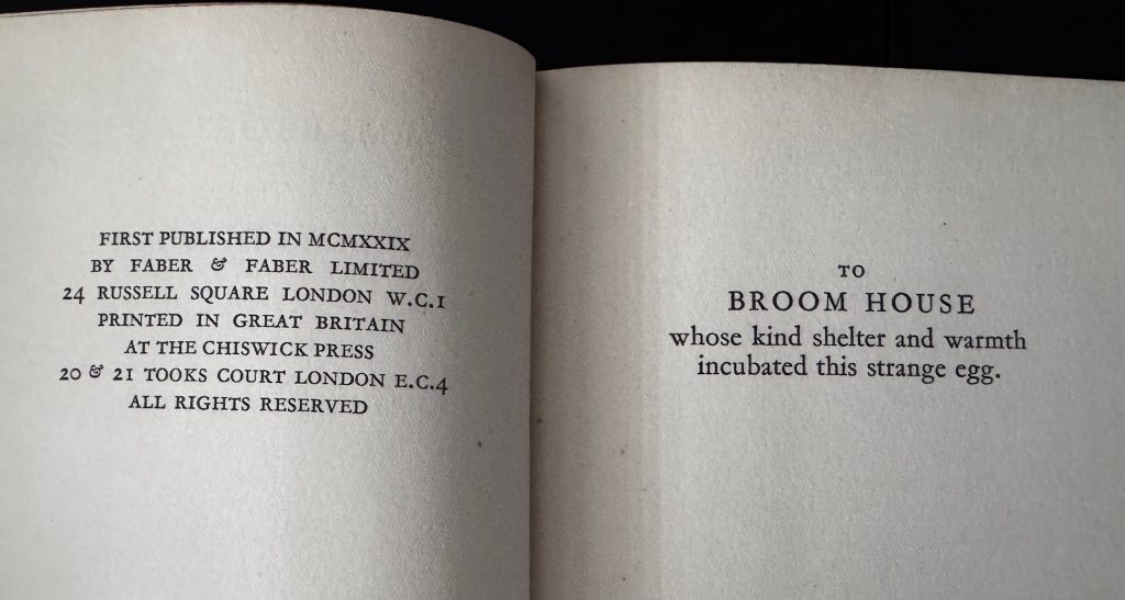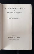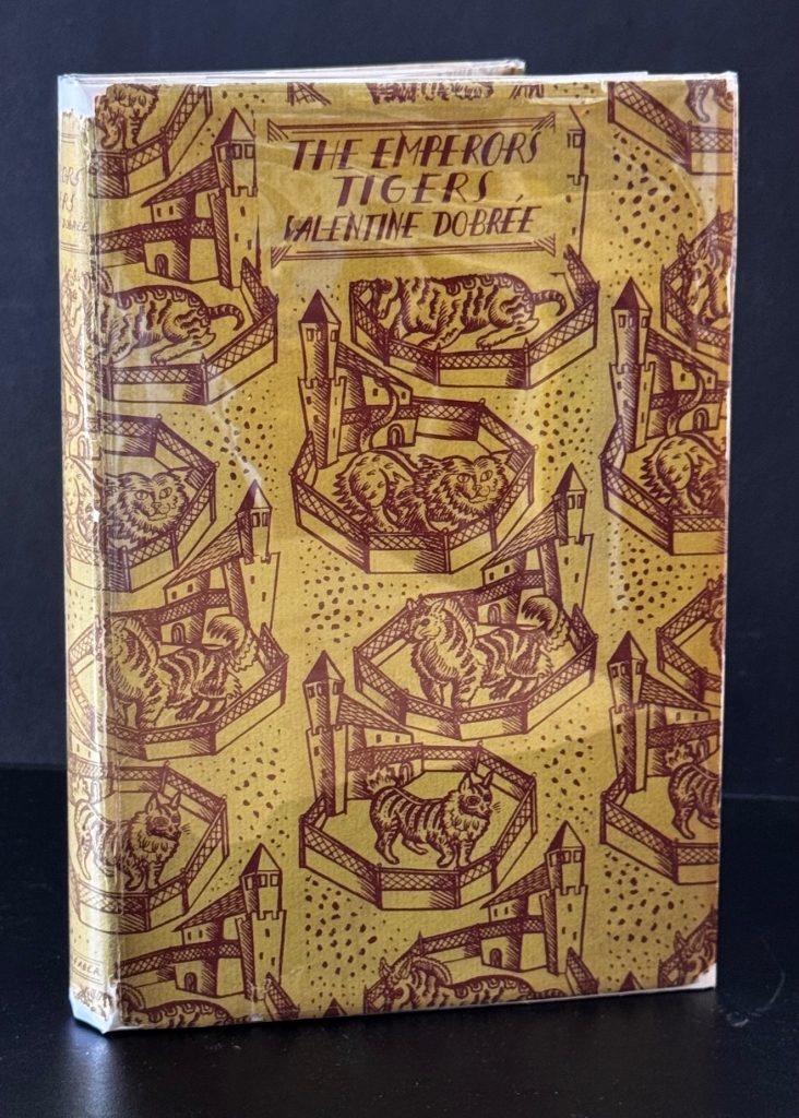 The sole UK printing published by Faber and Faber, London in 1929. Original publisher's green cloth, spine lettered in gilt; upper edge top- stained purple, else untrimmed; striking decorative endpapers matching wrapper design (unattributed artist), priced 6s. net to the front flap; The BOOK is in Very Good++ or better condition with a couple of splash marks and scratches to the upper edge; lightly bumped to spine tips; The WRAPPER is in Very Good condition, retaining much of its original colour, with moderate splitting along the spine and folds. The front flap is detached. There are some losses to the ends of the spine and folds; spine a touch toned. The striking wrapper however comes together very well and is protected in a removable Brodart archival cover. An interesting work, the second novel by the visual artist, novelist and poet Valentine Dobree. Dobree (nee Gladys May Mabel Brooke-Pechell) was born in India in 1894, and studied art under the tutelage of Andre Derain. In 1913 she married Bonamy Dobrée, and after the war traveled to London, where she became involved with the London Group and the Bloomsbury Group. She began an affair with the painter Mark Gertler, who produced two portraits of her - one in 1919 and the other in 1920. Her first, semi-autobiographical book, ‘Your Cuckoo Sings by Kind’, was published in 1929, and 'The Emperor's Tigers', with more fantastical undertones, followed shortly after. Dobree's works were much admired by writers such as T. S. Eliot and Graham Greene, though are little known today. Better remembered are her surrealist paintings, though she once described herself as “one who regards the arts as a many-faceted crystal rather than as personified by separate Muses”. A very elusive title, especially so in the striking wrapper.