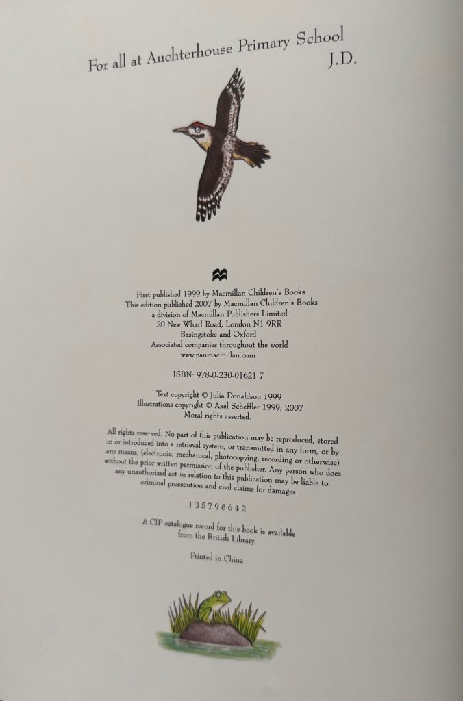 The First UK printing published by Macmillan, London in 2007 of this 'Gift Edition'. 8vo., publisher's dark green cloth with inlaid central image of the Gruffalo to the upper board, ruled in gilt; decorated with forest borders in gilt to upper cover; lettered gilt to spine, and with mouse motif gilt to lower cover; illustrated endpapers, and illustrated copiously throughout in full colour; housed together in the highly decorative publisher's slipcase, priced to the lower edge, with rectangular sticker ("Visit www.gruffalo.com for Gruffalo activities, games and fun!") as issued ; The BOOK is in Fine condition ; THE SLIPCASE very near Fine, with just the tiniest rubbing to the spine tips, ever-so-slight lifting of paper to the upper edge. Donaldson's most popular and enduring work, with full number line 1-9. Signed by the author and illustrator in black ink to the title page, along with the location and date ('London, 13. 4. 2011') by Scheffler to the lower edge, and a charming doodle of a mouse. 'The Gruffal'o won the 1999 Gold Award Smarties Prize. This copy also comes together with a Smarties Book Prize Bookmark loosely inserted. Arguably the UK's most popular Children's author, Julia Donaldson is the author of over 180 published works, many of which are for use in school settings. With a background in theatre, television and radio, Donaldson taught in primary schools and composed songs until 1991 when, at the age of 43, she was approached by Methuen to adapt her song 'A Squash and a Squeeze' into a picture book for children. Two years later, the work was published, and was the first of her many collaborations with the German-born illustrator Axel Scheffler. In 1999, they collaborated once again on 'The Gruffalo', a work which was to shoot both the author and illustrator to international acclaim. Inspired by the Chinese folk tale 'The Fox that Borrows the Terror of a Tiger', the plot follows a clever mouse as he persuades the fearsome monster that he is the most revered and scariest creature in the entire forest. Donaldson later wrote that she went over several iterations of the central character with Scheffler before deciding on his final appearance. 'I told this story in quite a few schools before sending it to Axel', she claimed, 'and some of the children drew me pictures of how they thought a Gruffalo would look. Sometimes he looked a bit like a robot or a creature from outer space! But as soon as I saw Axel’s version I knew that’s what he was supposed to look like – a kind of woodland creature that is both scary and comical.' The book has since sold over 13 million copies, translated into over 100 different languages, and has been adapted into audiobooks, plays, and perhaps most famously, a BBC film, which first aired on Christmas day 2009 starring Robbie Coltrane as the Gruffalo, James Corden as the mouse, Helena Bonham Carter as the squirrel, John Hurt as the Owl, Tom Wilkinson as the Fox and Rob Brydon as the Snake. 'Who is this creature with terrible claws and terrible teeth in his terrible jaws? He has knobbly knees and turned-out toes and a poisonous wart at the end of his nose. His eyes are orange, his tongue is black. He has prickles all over his back...' This edition, appearing eight years after the first, constitutes a rather deluxe publication, with beautifully-decorated cloth boards and slipcase. Scarce, particularly so signed and doodled thus.