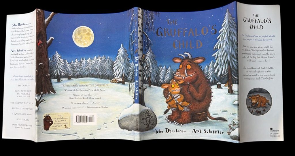 The First UK printing (with full number line present) published by Macmillan, London in 2004. Both the BOOK and the WRAPPER are in near Fine condition. The book appears unread. The wrapper is protected in a removable Brodart archival cover. Signed (without dedication) by both Julia Donaldson and Axel Scheffler to the title page. Axel Scheffler has also doodled a head of the Gruffalo's child next to his name. Loosely inserted is an unused publisher's promotional sticker of The Gruffalo. A sharp copy of the sequel to the The Gruffalo. Very collectible.