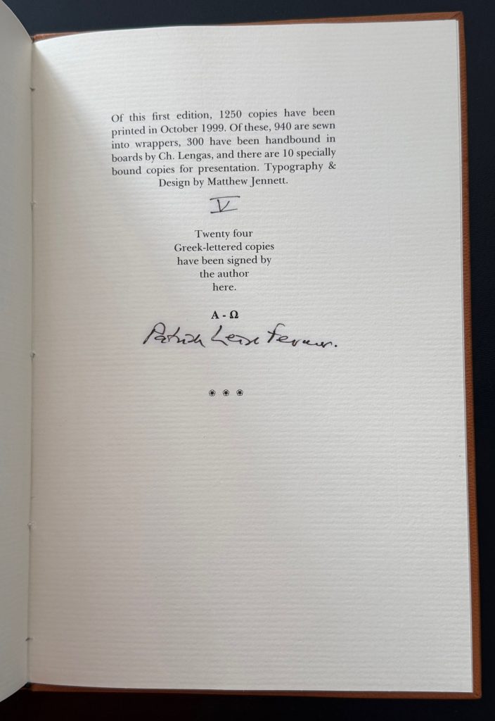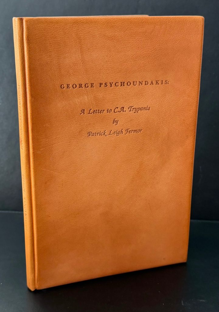 The sole printing published by Athens, The American College Of Greece in 1999. Number ‘V’ of only ten specially bound copies for presentation from a total limitation of 1250 copies. Signed By Patrick Leigh Fermor to the limitation page. Bound in full morocco with blind stamped titling as issued. Typography and design by Matthew Jennett. The text of a letter addressed to Oxford professor Constantine Trypanis (in English and Greek) about the contemporary Cretan poet and resistance hero George Psychoundakis who translated both the Iliad and The Odyssey into his local Cretan Dialect. Psychoundakis was also the author of 'The Cretan Runner', a memoir of the Cretan occupation which Leigh Fermor had translated and also had provided the introduction. Loosely laid in are the invitation and programme for the book launch at The American College of Greece, Aghia Paraskevi on the 1st November 1999. A handsome production. Scarce.