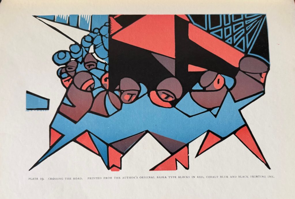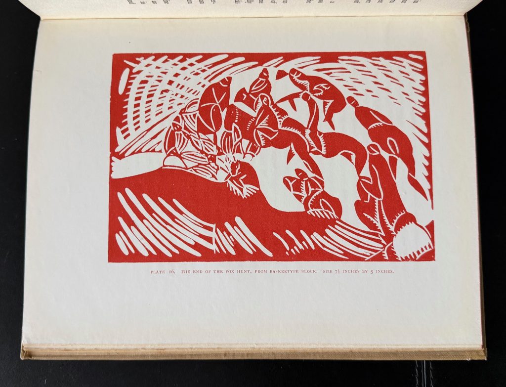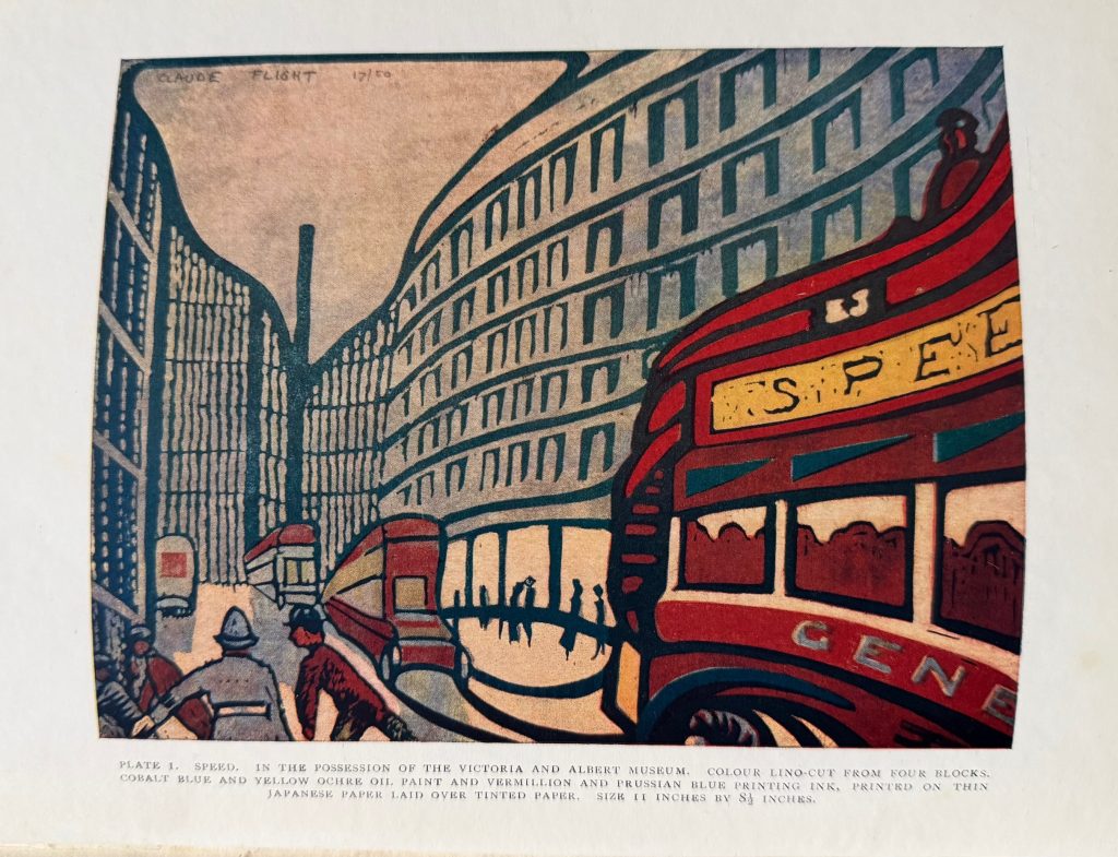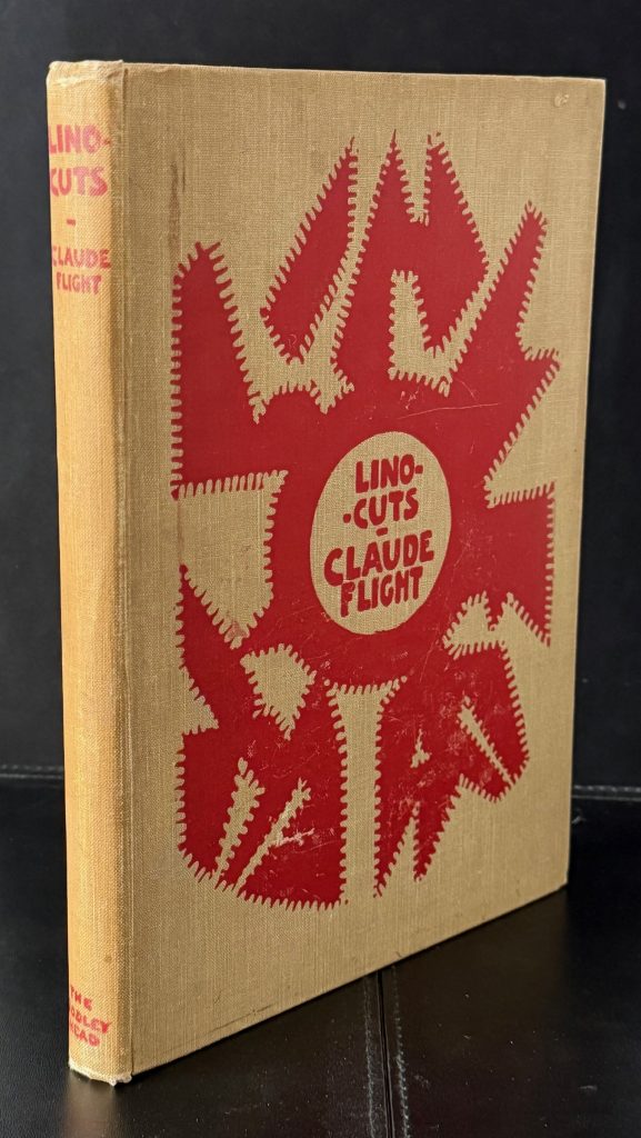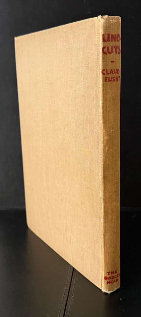 The First UK Printing published by John Lane / The Bodley Head Limited, London in 1927. Large 8vo., beige linen-covered boards lettered and decorated in red to upper cover, and lettered in red to the backstrip; top-stain red remains vibrant ; with frontis and a further nine illustrations in full colour, as well as eighteen in black and white, the latter both full-page and in text; The BOOK a Very Good++ smart example with slight toning and light marking to the boards ; with a little rubbing along the spine folds ; endpapers offset with a near contemporary penned ownership name and date to front paste down; internally very good, lightly toned with occasional spots to the margins due to the quality of the paper stock used. The First UK edition, which includes an original linocut, 'Crossing the Road' by Claude Flight printed from the artist's original lino blocks in red, cobalt blue and black. Flight was educated at the Grosvenor School of Modern Art, which had been founded by the Scottish wood engraver Iain Macnab in 1925. It was there that the art of original linocut was first pioneered in the UK and Flight, surrounded by a team of talented young artists and teachers including Cyril Power and Sybil Andrews, soon began teaching there himself. Known for championing MacNab's principles of rhythms, counter-rhythms, sweeping lines and carefully organised sequences of differing colours, Flight is remembered today for developing the art of lino cutting to its full potential. His students later included the artists Margaret Barnard, Leonard Beaumont, Dorrit Black and Diana Drew. Published relatively early on into his career, the present work includes plates by Diana Drew, who at age just 13 and 15 shows "good direct cutting of well-arranged imaginative design" and "a more mature conception based on visual facts". The in-text illustrations further show various tools needed for lino cutting, including oil stones, gouges, burnishers and rollers. Increasingly scarce as the first issue.