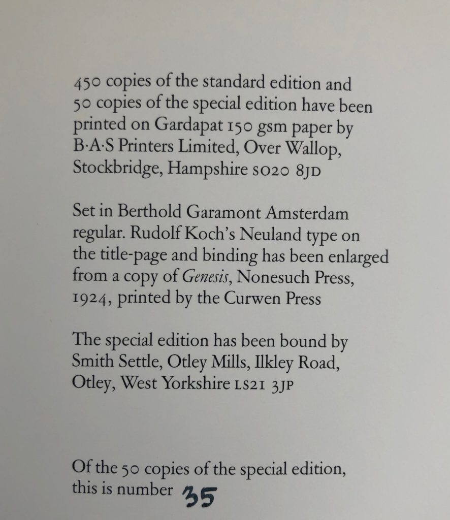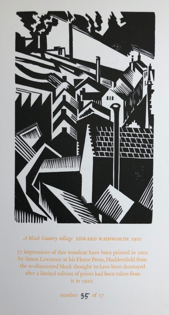 The sole UK printing published in Wood Lee Press, Woodbridge, 2002. The BOOK and SLIPCASE are in Fine condition. 450 copies of the Standard Edition and 50 copies of the Special Edition were printed, this being No. 35 of the Special Edition, containing the original Edward Wadsworth woodcut, 'A Black Country Village', 1920 (also numbered 35) and expertly printed by Simon Lawrence, at the Fleece Press, Huddersfield, from the re-discovered block thought to have been destroyed. Quarter red Morocco over black and white decorative boards from Wadsworth design. Rudolph Koch's Newland type on title page and spine has been enlarged from a copy of Genesis (Nonesuch Press, 1924) and has been bound by Smith Settle, Otley Mills, West Yorkshire. The book is housed in a handsome grey cloth solander box (14.5" x 11") with gilt lettering on red panel to spine. The book, woodcut and box are all in fine condition. Edward Wadsworth ARA was an English artist, most famous for his close association with Vorticism. He painted, often in tempera, coastal views, abstracts, portraits and still-life. He was also an engraver on wood and copper. He moved away from the avant-garde in the 1920s, and adopted a more realistic style. Wadsworth was a member of Unit One (Wiki). With the publisher's four page prospectus loosely laid in. Scarce.