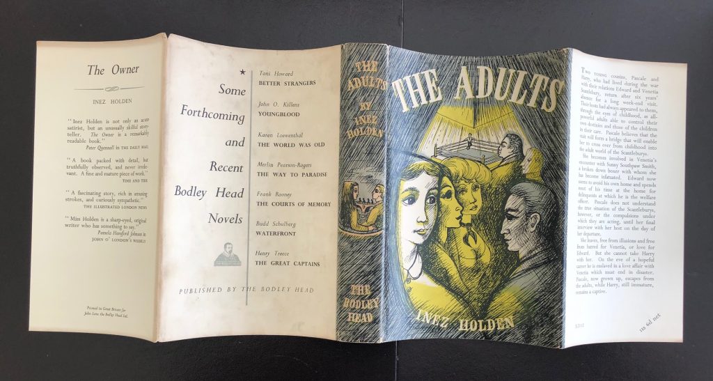 The First UK printing published by The Bodley Head, London in 1956. The BOOK is in near Fine condition. A hint of pushing at the spine ends with a little light toning to the text-block and a little spotting to the upper text-block. The pages are clean. Free from inscriptions and erasures. The WRAPPER is complete and is in near Fine condition with just one small closed tear at the upper front spine fold. The period wrapper artwork (by 'Morriss' - ?? Morris Kestelman) looks very striking in the removable Brodart archival cover. A very scarce title from Inez Holden who was a British author and journalist whose work was admired by the likes of Graham Greene and Anthony Powell. A glamorous socialite, Holden became a close friend and lover to George Orwell after they were introduced at a dinner party held by H. G. Wells in 1941. Collectible.