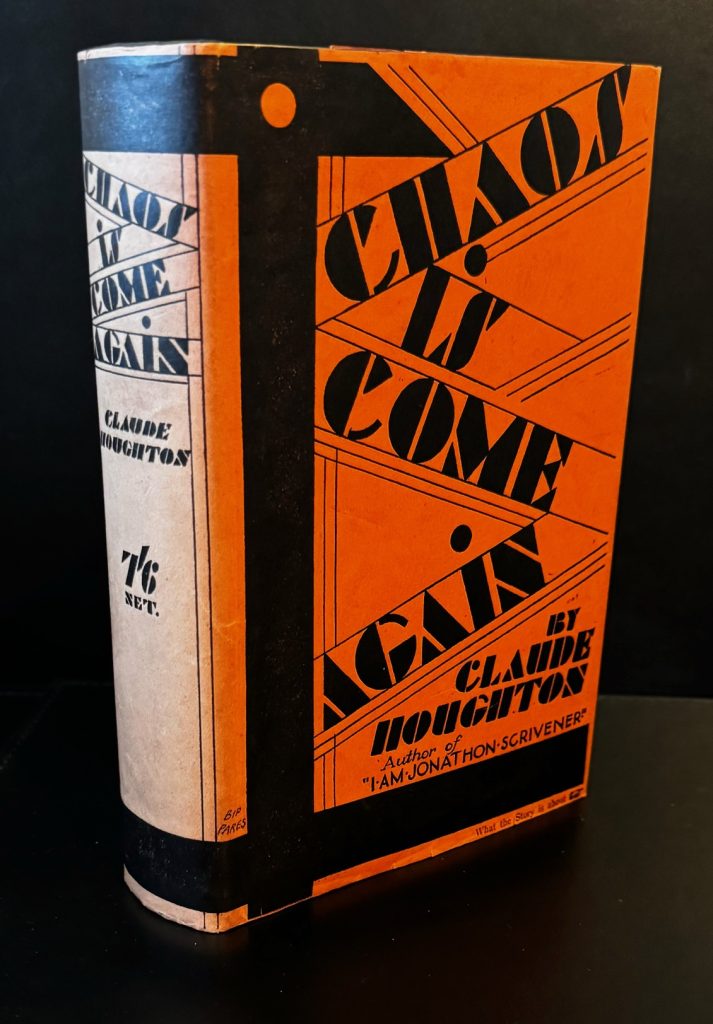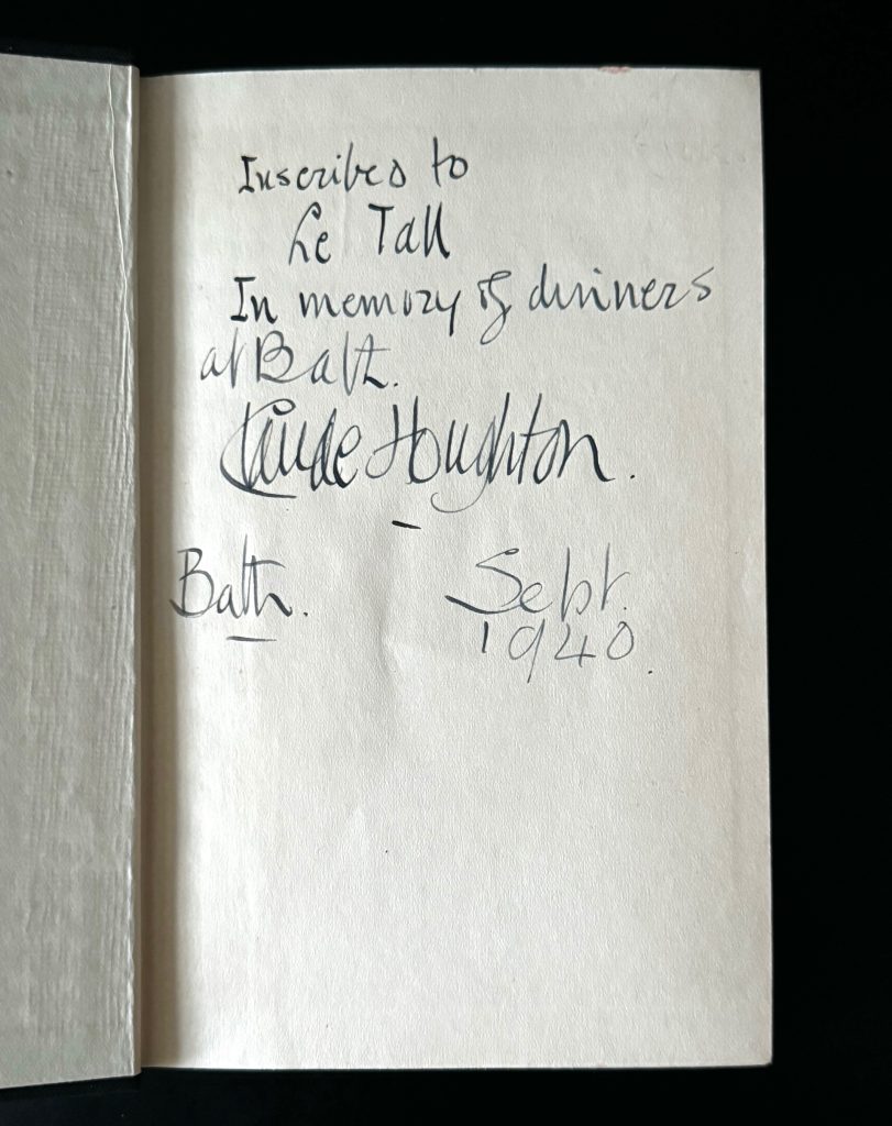 The First UK Printing published by Thornton Butterworth Limited, London in 1932. 8vo., black cloth embossed in blind with titles, lines and publisher’s device to boards, lettered in vibrant red along the backstrip; together in the red and black printed wrapper (7’6 net to spine), designed by Bip Pares; THE BOOK a Very Good++ to near-Fine copy, the cloth clean and vibrant; with light spotting to the edges of the text block, and mild shelf lean; the Very Good++ WRAPPER evenly sunned along the backstrip, with very minor shelf-wear and one tiny abrasion to the front flap; neatly reinforced with tape to the verso; otherwise an exceptional copy of a scarce work. The wrapper is protected in a removable Brodart archival cover. First edition of Houghton’s sixth novel, this copy inscribed by the author to the front endpaper: 'Inscribed to ‘He Tall’ In memory of dinners at Bath. Claude Houghton, Bath 1940'. A sharp, witty satire of interwar England, in which tutor Vernon Dexter arrives at a decaying country house of a notorious family (‘Greystones’) to teach their disabled son, Eric. While the Lord of the manor (Sir Keith Petersley) is a notorious philanderer, his wife Lady Isabelle protects herself behind a veil of eccentricities. Set in 1932 against the backdrop of a nation still recovering from the wounds of the First World War, the family’s bizarre behaviour and denial of their declining influence are of course representative of the national as a whole. It is, however, in his prognoses about the effects of capitalism that Houghton’s message truly hits home, with the episodic nature of the plot representative of the fragmental nature of the time in which he writes (the blurb mentions a “chaotic age in which the Normal is only a memory”.) In fact, Houghton himself had once famously stated that all his fiction was based on the belief that modern civilization would collapse "because it no longer believes it has a destiny." The author’s predictions would of course come to some sort of fruition with the advent of WWII, although in a different way to those predicted (the characters believing it will all end in socialist revolution). Houghton was well-regarded in his time, but is little-remembered today. Born in Sevenoaks in 1889, he was educated at Dulwich College, and worked as an accountant before serving in the admiralty during the war, having been rejected from active service due to poor eyesight. Counting amongst his friends and contemporaries such figures as P. G. Wodehouse, Clemence Dane and Hugh Walpole. He was a prolific correspondent, and devoted much of his time to answering letters and signing books for his readership. His friend and admirer Henry Miller once claimed that “Claude Houghton has done more than any Englishman, with the exception of W. Travers Simons - the first ‘gentleman’ I ever met! - to alter profoundly my picture of England”, with Norman Collins adding that “Had Emily Brontë written Heartbreak House the result might have been rather like Mr. Claude Houghton’s richly inventive Chaos is Come Again”. Increasingly uncommon with the Bip Pares dustwrapper, with COPAC recording just five copies institutionally.