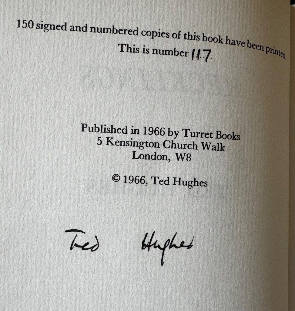 8vo., textured grey cloth, lettered in gilt to backstrip; yellow endpapers; together in the original pale grey dustwrapper, printed with titles in gold; The BOOK with one tiny spot to the fore-edge, else near fine in near-fine WRAPPER (some very faint patches of fading). The wrapper is protected in a removable Brodart archival cover. First, limited edition and sole UK printing. Number '117' of only 150 numbered copies issued. Signed by Ted Hughes to the limitation page. Hughes’ third collection of poetry, and an exceptionally clean example of this collection of 32 poems. In such a limited print run, the full body of work was not available to wide readership until 'Collected Poems' (published 2003), although some of them appeared in 'New Selected Poems 1957-1994'. The lack of critical response to the publication was attributed to the apparent devalued status the poet afforded it, with the title literally referring to the weakest of a litter, runts, or those least able to survive. In a letter to Janos Csokits dated 21 April 1967, Hughes had written that "‘Recklings’, the thin grey book, is a collection of bits & pieces which didn’t seem to me to fit into WODWO – not good enough or simply irrelevant." A month later he wrote to Daniel Huws "Here is RECKLINGS; pig’s litter, and a preposterous pretentiorisation of better days. RECKLINGS is what I threw out of the nest the better to fatten / my great cuckoo, WODWO, which will take wing in May.” The subjects of the verses vary hugely, and include the countryside and its various flora and fauna, fishing, the First World War, history, education, life, death, and everything in between. The tone of the overall collection, however, is tinged with a dark and sombre energy, most likely due to the fact that it was the first to be published in the aftermath of Sylvia Plath’s death. “If I stop my heart and hold my breath”, he writes in ‘Memory’, The needle will thread itself. Daring the no-man quiet of my non-being…”. ‘Bawdry Embraced’, the final poem to appear, also celebrates his early relationship with Plath, and was written as early as February 1956: “He questioned none: ‘It is enough that she is and I am’ ”. Other poems included here, such as ‘Unknown Soldier’, ‘Flanders’, and ‘A Colonial’, draw on his father’s own personal experiences of the horrors of war. William Henry Hughes had enlisted with the Lancashire Fusiliers and fought at Ypres, and the stories of Flanders fields filled Hughes' childhood imagination, with Hughes later claiming that the stories he heard during the first six years of his life “shaped everything." A rare work, particularly so in the wrapper.