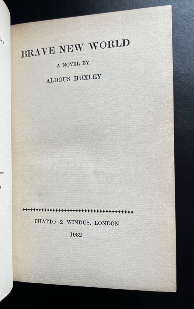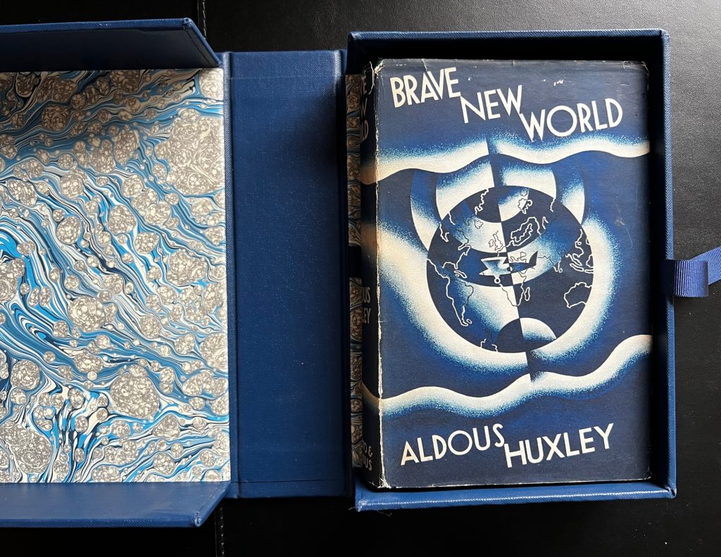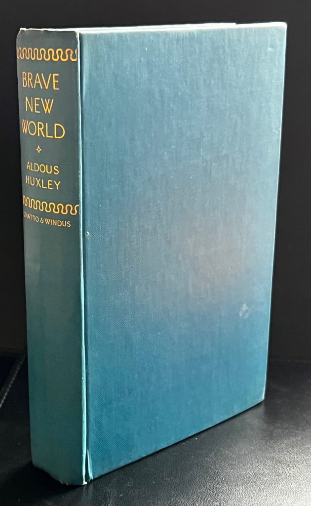 The First UK printing published by Chatto and Windus, London in 1932. The BOOK is in Very Good++ or better condition. Original blue boards with slight fading of the blue colouring to the spine. Gilt titling and decoration remain vibrant. Light pushing at the spine ends and a tiny bump to the lower rear corner. Neat 'Henry Sotheran' bookseller sticker to the lower front pastedown. Free from inscriptions. A hint of toning to the text-block and extreme page edges. The WRAPPER is complete and is in Very Good++ condition. It is correctly priced at '7s. 6d.net' to the front tower flap. A few rubbed areas to the upper spine end with a little loss, not involving the lettering. Some rubbing to the folds and corners and small losses at the upper corners. Light edgewear with a few nicks and small closed tears in places and a light horizontal scratch to the rear panel. Light toning to the spine. The wrapper artwork looks striking in the removable Brodart archival cover. A nightmarish prognostication of a future in which humanity has been destroyed by science. Easily Huxley's most popular (and many good judges continue to think his best) novel' (DNB). 'After the success of his first three novels, Huxley abandoned the fictional milieu of literary London and directed his satire toward an imagined future. He admitted that the original idea of Brave New World was to challenge H.G. Wells' Utopian vision. The novel also marks Huxley's increasing disenchantment with the world, which was to result in his leaving England for California in 1937 in search of a more spiritual life. The book was immediately successful' (Parker & Kermode, 161-62). Named by Modern Library as one of the 100 Greatest Novels of the twentieth century. Housed in a custom solander box with gilt titling, marbled inserts and a silk tie. A sharp copy of an increasingly elusive title to find in collectible condition.
