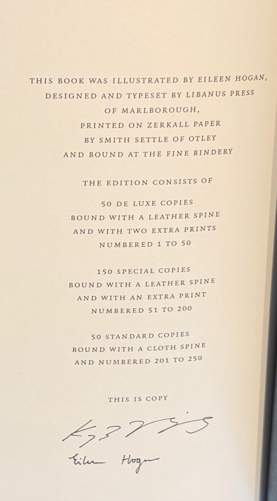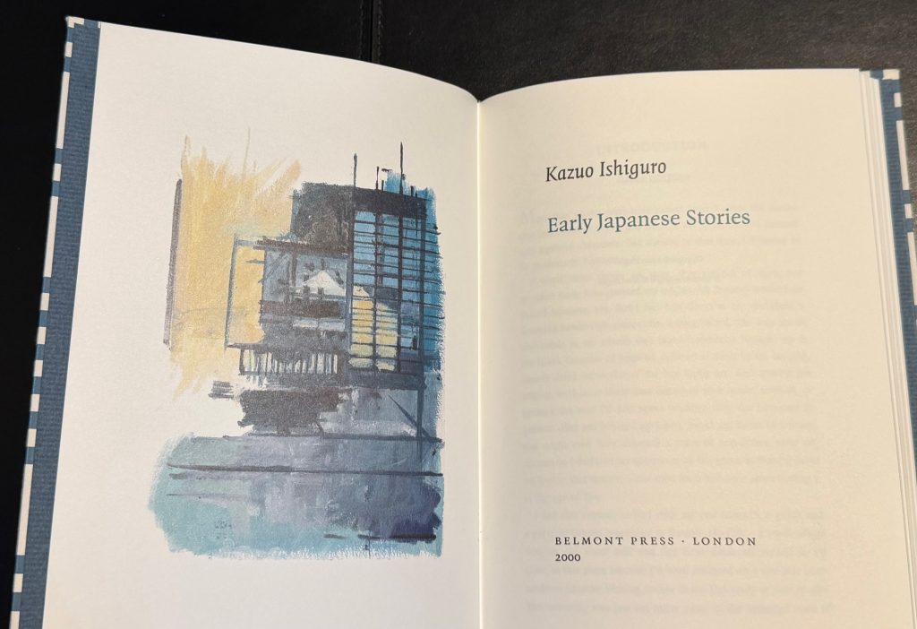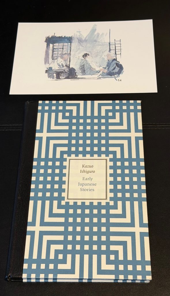 The Sole UK printing published by Belmont Press, UK in 2000. The BOOK is in near Fine condition. An out of series unnumbered copy of 150 'special' signed and numbered copies (from a total edition of 250 copies), with an extra original print initialled by the artist, loosely inserted into a pocket to the rear. Quarter bound black morocco, with decorative blue and white patterned boards, titling in silver to the spine, with sage green end-papers. The book has been signed by both Kazuo Ishiguro and Eileen Hogan on the limitation page. The first 50 copies (labelled de-luxe) were bound in quarter leather with two extra prints, whilst the last 50 (standard) copies were quarter bound in cloth and had no extra loose prints. Designed and typeset by Libanus Press of Marlborough. Printed on Zerkall paper by Smith Settle of Otley and bound by The Fine Bindery. Beautifully illustrated in colour throughout by Eileen Hogan. The book is protected in a loose Mylar archival cover. Three stories set in Japan, written by the author some two decades prior to publication. A very handsome production and an increasingly scarce title from the acclaimed Nobel Laureate author.
