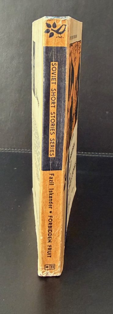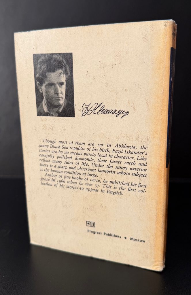 The First English printing published by Progress Publishers, Moscow in 1972. 12mo.., decorative glued card wraps as issued, printed with designs in orange, black and blue to upper cover and spine; black and white photograph of the author, together with blurb, to the lower cover; with numerous black and white illustrations throughout; upper edge top-stain blue; The BOOK is in Very Good++ condition, a little rubbed at the edges and toned along the spine; nicking and small losses to the spine tips; lower cover lightly shelf worn; light spotting to the outer edges of the text block; purple ink stamps from a book centre seller in Rawalpindi Cantt, Pakistan to the the front blank end-paper and title page. The book is protected in a removable Mylar cover. First English edition, in printed wraps as issued. No hardback format was issued. The author's debut book in English, with the stories predominantly set in Abkhazia near the Black Sea. Iskander first began publishing short stories in the 1960s, and perhaps one of his most famous from that period was translated into English as 'The Goatibex Constellation', criticised by many upon publication for its outwardly sardonic satire of Lysenkoism. The stories in this volume include 'Something about Myself', 'A Time of Lucky Finds' and 'The Thirteenth Labour of Hercules'. Iskander later became known for his comic novel 'Sandro of Chegem', a book which would earn him the title of 'an Abkhazian Mark Twain.' 'As humorist and satirist', the Professor Lesley Milne later wrote, 'he operated on the borderline between the permissible and the prohibited, constantly and deliberately overstepping the mark'. Scarce.