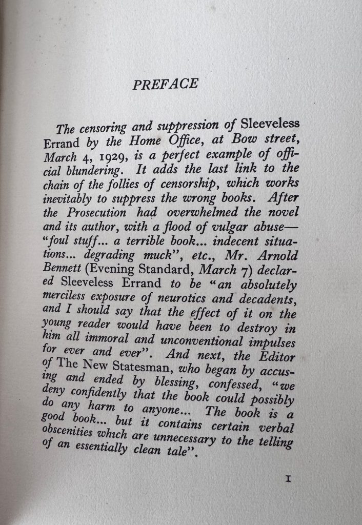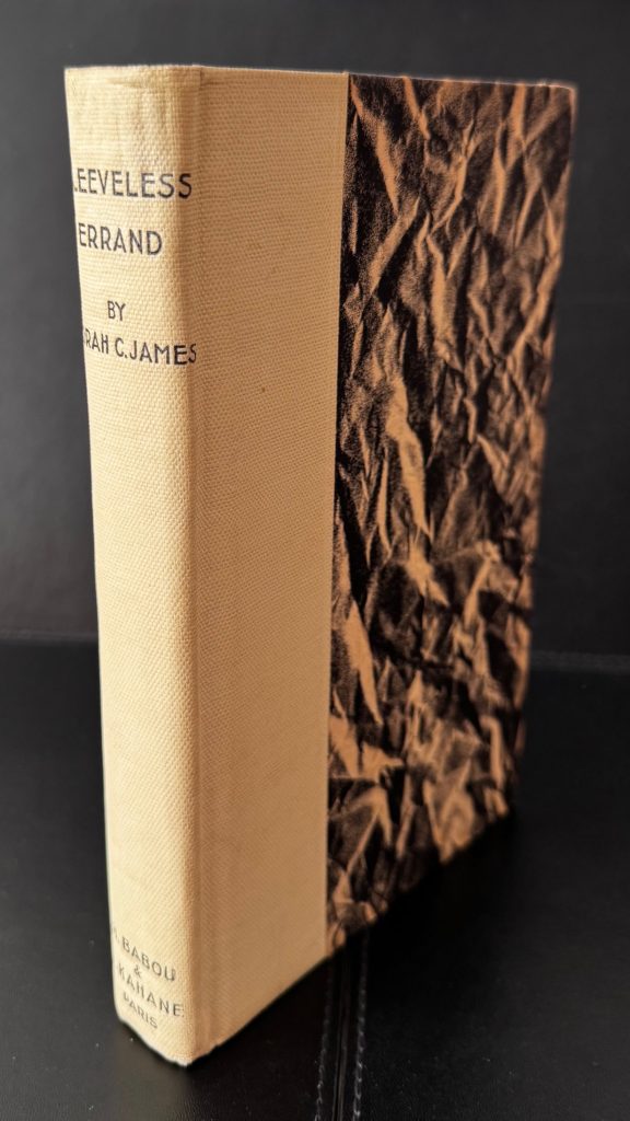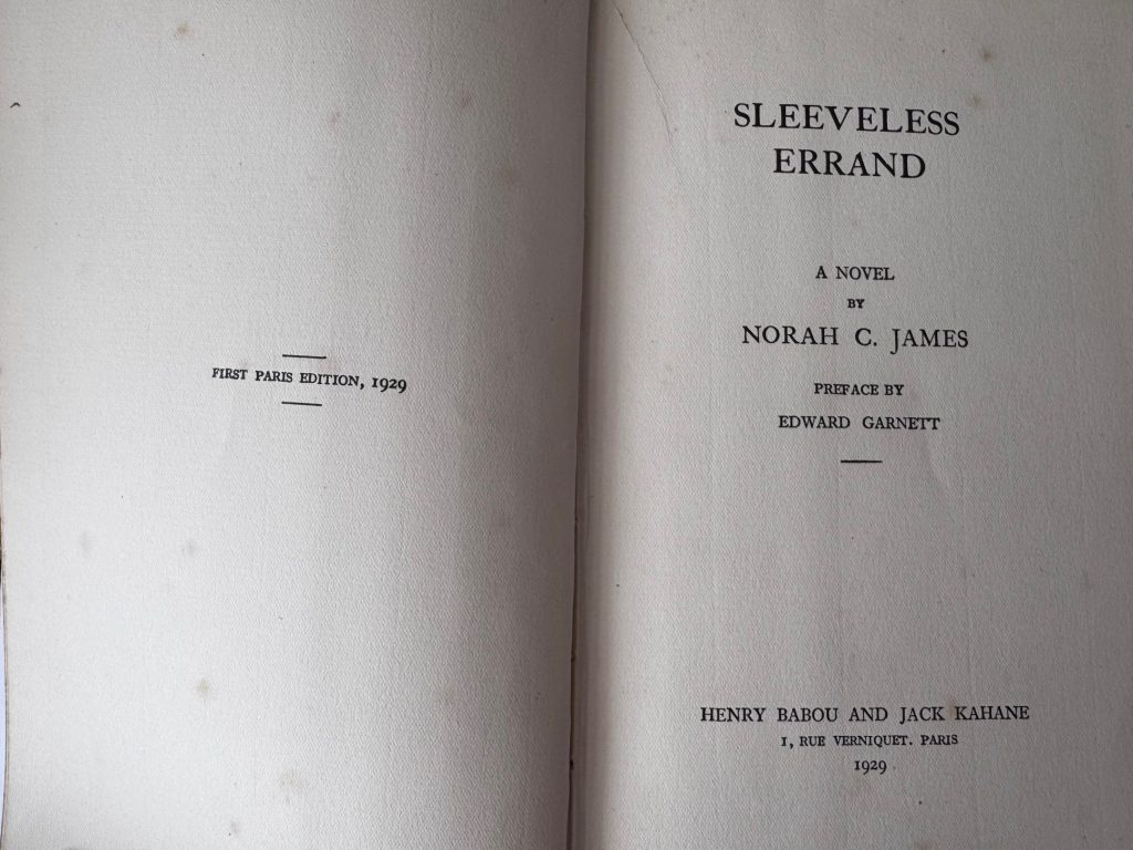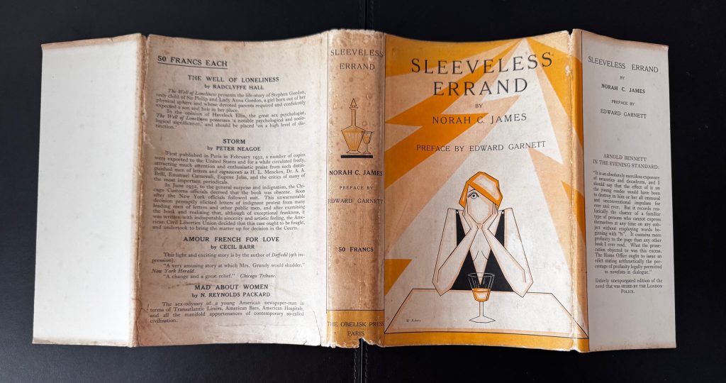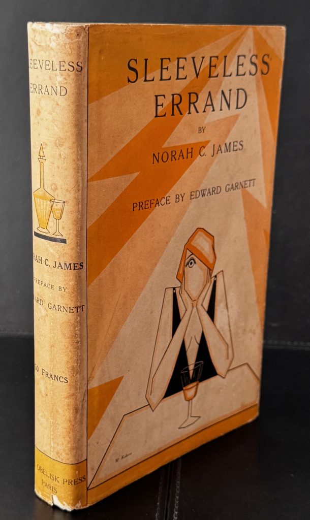 The First Paris edition published by Henry Babou and Jack Kahane, Paris in 1929. Large 8vo., cream cloth-backed decorative black and white boards; spine lettered in black; outer edges untrimmed; together in the original pictorial wrapper printed in black and yellow, priced '50 Francs' to the spine, and featuring a striking period design by M. Kahane ; The BOOK is in Very Good++ or better condition. A little bubbled along the backstrip, with spotting to edges of text block and prelims, and the odd spot throughout. Some light splash marks to the lower edge of pages 90-91 ; The WRAPPER is in Very Good++ condition. The panels and spine are a little toned, with some light spots and marking; rubbed to folds; some small nicks, chips and closed tears to extremities, the longest 3.5cm approx; repaired to the verso with tape. The wrapper artwork looks striking in the removable Brodart archival cover. First Paris printing in the second state wrapper which is exactly the same as the first issue in design but detailing 'The Obelisk Press' as the publisher, the price as '50 francs' (initially sold at 100 francs) and the rear panel carrying four Obelisk Press titles, the last of which, 'The Well of Loneliness' dates the wrapper from no earlier than May 1933. Indeed, James knew Radclyffe Hall well, and attended the 1928 obscenity trial for 'The Well of Loneliness'. Here, the Arnold Bennett review quoted on the front flap has also been reset, and beneath it now appears 'Entirely unexpurgated edition of the novel that was SEIZED BY THE LONDON POLICE'. The wrapper artwork, the same as the first, was provided by the artist Marcelle Kahane (the publisher's wife). Kahane had overestimated the demand for the book in 1929 and consequently found himself with piles of unsold copies. These went on to be sold in the 1930's, as here, in the second issue wrapper, the revised wording of which claimed the book for the Obelisk Press. The first Paris edition of Norah James' debut novel, which was banned in the UK shortly after publication. The novel follows Paula, a bohemian jilted by a lover, with an existential itch. She resorts to suicide, forming a pact with a stranger to drive off of a cliff. Though the stranger backs out, Paula proceeds with the plan. Originally printed in London by Scholartis Press, a proof copy of that edition was, as the wrapper correctly states, seized and the publisher was prosecuted by Bow Street Police Court. Of the 750 copies produced, 517 were confiscated before they even hit the shelves, and most of the others were destroyed in the days which followed. Later investigation suggested that the police had been tipped off about the content from the editor of the 'Morning Post', shortly after they had received the review copy. It was subsequently printed in Paris that same year by Jack Kahane's Obelisk Press. According to one publication, 'Sleeveless Errand' was likely the most suppressed novel ever to be published in England. Every store containing copies was raided, and a guard was posted to stand outside one such location for an entire weekend before the owner could be located to remove it. Even today, no-one has been able to provide an adequate explanation for this reaction, and why it was censored so intensively, although one theory suggests that it was because of one specific word printed in the book. The official basis for the prosecution was that the novel could have a degrading, immoral influence, and 'tended to excite unhealthy passions'. The publication undoubtedly sparked a lively debate concerning censorship, with Arnold Bennett calling it a "merciless exposure of neurotics and decadents" and Garnett defending the apparent blasphemy and promiscuity by comparing it with Hemingway's 'Fiesta', which received none of the same treatment. Such drama did nothing to sway James from a literary life, and her subsequent output of novels was prolific. A scarce copy of this wonderfully designed book. (My thanks to : Pearson, Neil ~ Obelisk: A History of Jack Kahane and the Obelisk Press, 2007).
