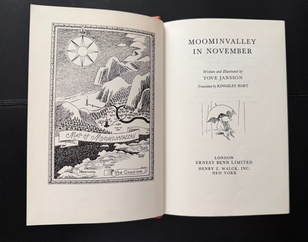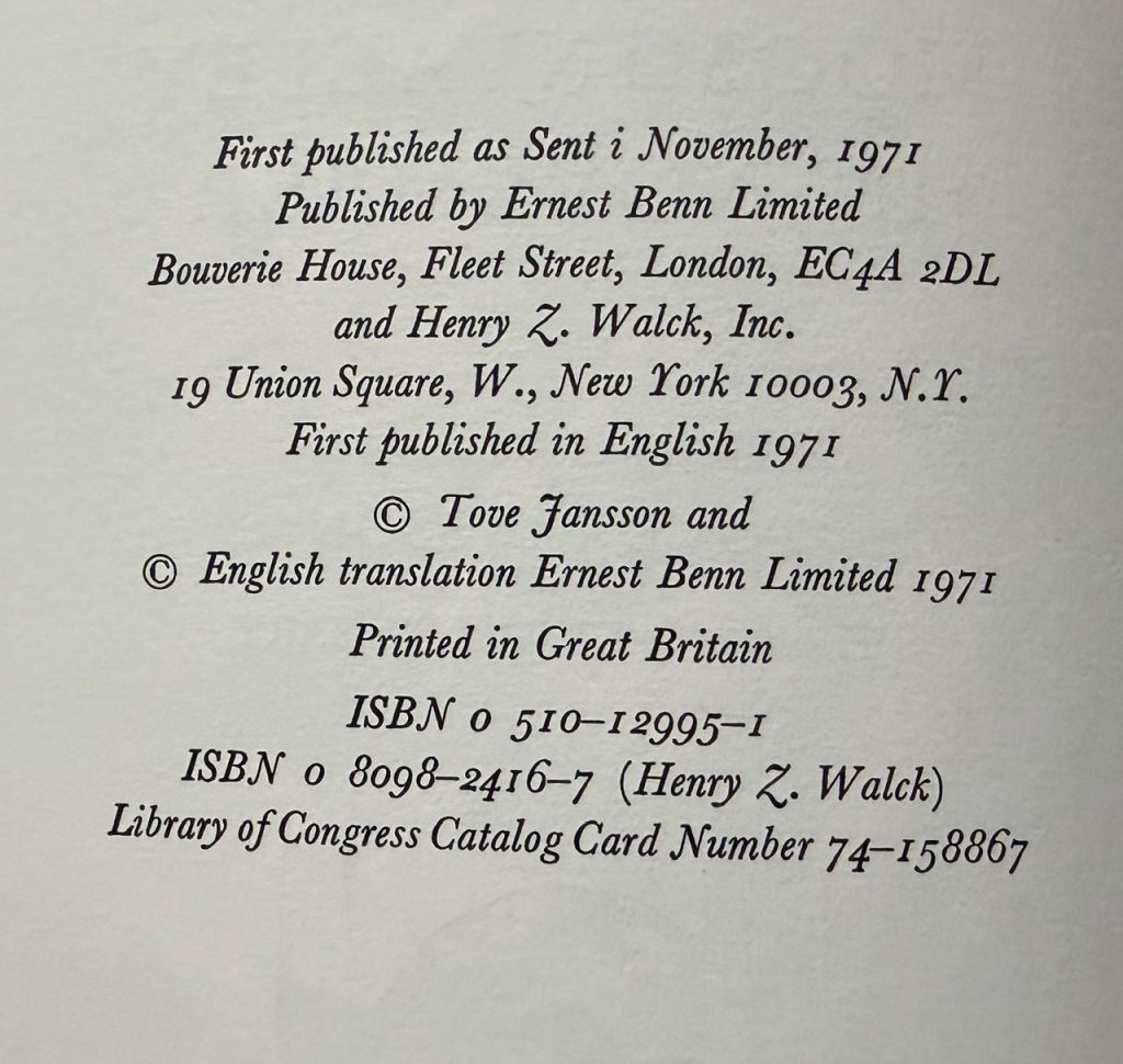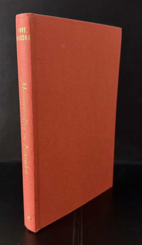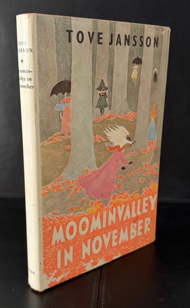 The First UK Printing printed by Ernest Benn Limited, London in 1971. 8vo., peach-coloured boards lettered in gilt to spine; together in the neatly-clipped printed wrapper featuring some of the Moomins in an autumnal wooded scene; with frontis, title vignette, and numerous other illustrations in line throughout the text, all by Tove Jansson; The BOOK is in near Fine condition with some very light pushing at the spine tips; with some faint spotting and offsetting to the endpapers, else a lovely example in the WRAPPER which is neatly price-clipped and is in Very Good++ or better condition. Slightly faded and marked ; creased along the folds with some tiny losses to the ends of spine and folds; some very light overall rubbing but still in very very collectible condition. The wrapper is protected in a removable Brodart archival cover. The eighth title in the Moomin series, which was translated from the Swedish 'Sent i november', 'Late in November' by Kingsley Hart. The story is the only one in which the Moomin family themselves (pictured here on the wrapper hiding behind a series of trees) are absent, and instead the plot follows Snuffkin as he sets out for Moominvalley in Autumn in order to discover a song which he wrote there during the Summer. Joining him is Toft and Fillyjonk, as well as Grandpa-Grumble, who seeks to fish from the Moominvalley bridge. The book is one of the more sombre in tone, purportedly due to the death of Jansson's mother, Signe Hammarsten-Jansson, during the time of writing. It was to be one of the last books she wrote on the titular family. "I couldn't go back and find that happy Moominvalley again", she later claimed. The final scene sees Toft waiting on the jetty for the family's return: "They were coming from some island where Toft had never been and which he couldn't see, he thought. Perhaps they will make up a story about the island and tell it to themselves before they go to sleep. Toft sat high up on the mountain for several hours looking out at the sea." In 2025, the book was adapted for a stage adaptation which was performed at the Gatehouse theatre from 23rd October-16th November. Very elusive with the wrapper in such superior condition, as are all the Moomin titles now .