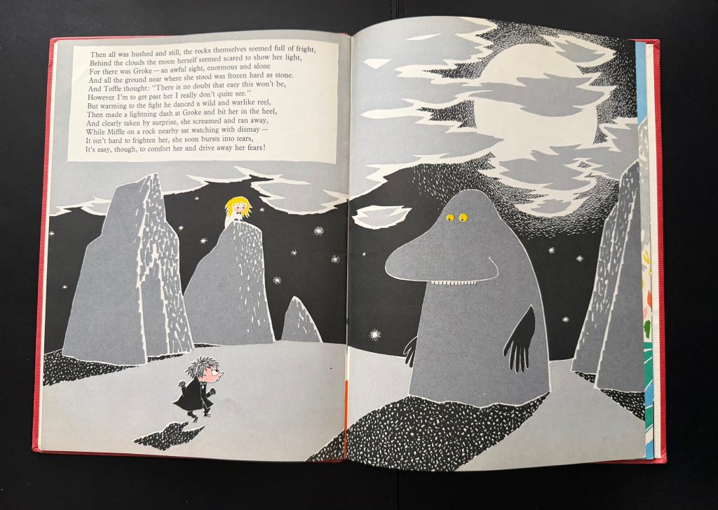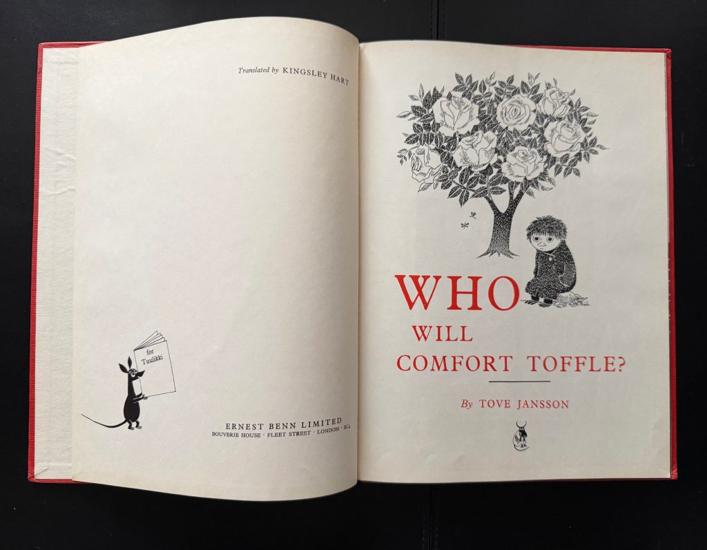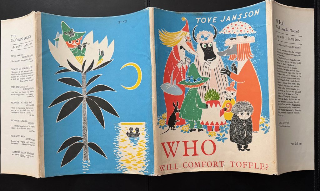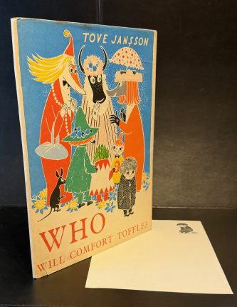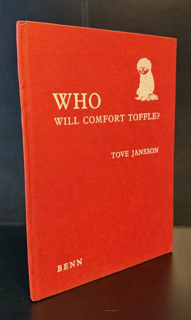 The First UK Printing published by Ernest Benn, London in 1960. The BOOK is in near Fine condition with just some minor bumping to the lower corners. Original red boards, with white lettering and an image of Toffle to the front board. Free from erasures and inscriptions. A hint of toning to the edges of the plain end-papers. Internally very clean. The WRAPPER is complete and is in near Fine condition. A few small nicks and light toning to the folds and the upper edge in places. Tiny rubs to the lower corners. The wraparound coloured artwork looks striking in the removable Brodart archival folder. Profusely illustrated in colour throughout by the author / illustrator Tove Jansson. Loosely inserted is a blank sheet of paper with a B/W image of Toffle to the right upper corner. This scarce ephemeral item is clean and in Fine condition, was issued with some of the copies at publication. Translated into English from the Swedish by Kingsley Hart, the lonely Toffle leaves his home to look for friends, eventually finding the Miffle and rescuing her from the Groke. As nice as copy as you are likely to find, and now increasingly elusive in any condition.