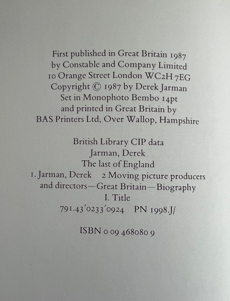 The First UK printing published by Constable, London in 1987. The BOOK is in near Fine condition. A hint of toning to the text-block and page edges. Free from inscriptions. The WRAPPER is complete and is in near Fine condition. Just a hint of creasing to the upper edges. The wrapper looks very striking in the removable Brodart archival cover. The book has been signed (without dedication) to the half-title by the author. Shortly after the filming began of 'The Last of England', Jarman also began work on this volume of his journals, which contains diary entries and interviews, notes on the script, stills from the filming, and B/W photographs of Derek, his family and friends. Amongst other things, Jarman writes of his childhood, coming to terms with his sexuality, life in the 60's and 70's, his early work as a painter and designer for Ken Russell's groundbreaking films and his debut as a director. A sharp copy. Signed titles by this author are very scarce.