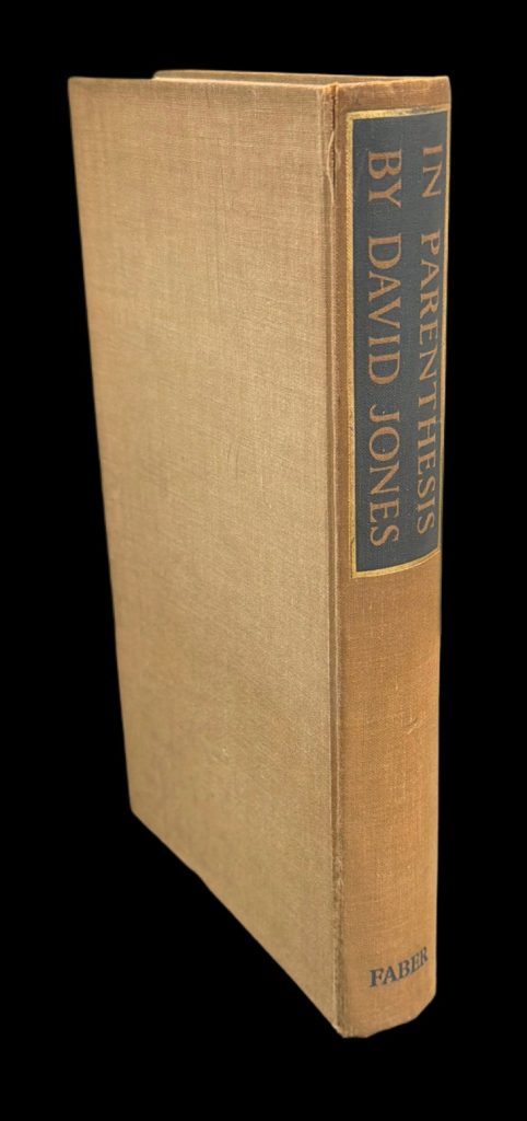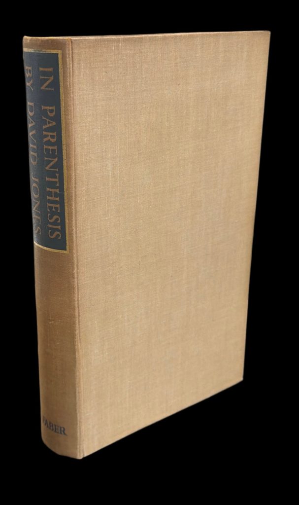 The First UK printing published by Faber & Faber Ltd., London in 1937. 8vo., oatmeal-coloured publisher's cloth with contrasting green painted label gilt to spine; frontis illustration in black and white by the author, along with another facing p.226, and a map facing p.193 ; The BOOK a nice copy in Very Good++ condition, lightly toned at the spine with a 2cm split at the rear upper spine fold ; lightly spotted to the prelims, with overall marginal toning and a previous small ownership sticker to the rear paste-down. The wrapper is protected in a removable Mylar cover. With a newspaper clipping regarding the author and a publisher's postcard loosely inserted. Lacking the elusive wrapper. David Jones (1895-1974) was born in Kent, the youngest of three children to James and Alice Jones, the former a Welshman born into a Welsh-speaking family. Beginning his career as an artist, David is recorded as claiming that he knew from the age of six that his life would be dedicated to art. During the First World War, he enlisted in the London Welsh Battalion of the Royal Welch Fusiliers, and served as an infantryman on the Western front from 1915–1918 in the 38th (Welsh) Division. He was wounded at Mametz Wood, recuperated in the Midlands, returned to the Ypres Salient, joining the attack on Pilckem Ridge at Passchendaele, and nearly dying of trench fever the year after. In all, Jones spent more time on the front line than any other British writer during the war. It was the experiences during these four years which would form the basis for his first literary work, 'In Paranthesis'. Jones suffered with post-war shell-shock (now widely known as PTSD), and during October 1932 it contributed to a nervous breakdown which in turn coincided with a period of intense writing and painting. During this time, he produced the first continuous draft of In Parenthesis, inspired by his first seven months in the trenches between December 1915 and July 1916. Part novel, part epic poem, and part memoir in a style entirely his own, the author assimilates cockney colloquial, military slang, and allusions to The Gododdin, The Mabinogion, and the sixth-century Welsh poem Preiddeu Annwn, altogether succeeding in aligning the Battle of the Somme with the catastrophic Welsh defeats at Catraeth in the 7th century and Camlan (the final battle of King Arthur). Jones was one of the first modern engravers to combine white-line and black-line engraving, and the two plates provided here are evocative, harrowing, and deeply moving. “I think the day by day in the Waste Land” he writes in his introduction, “the sudden violence and the long stillnesses, the sharp contours and the unformed voids of that mysterious existence, profoundly affected the imaginations of those who suffered it. It was a place of enchantment.” Jones’s literary debut won the Hawthornden Prize in 1938, and was widely admired by such writers as W. B. Yeats and T. S. Eliot. W. H. Auden later wrote that Jones did "for the British and the Germans what Homer did for the Greeks and the Trojans". T. S. Eliot declared it 'a work of genius' in the preface to his 1961 Faber re-issue.
