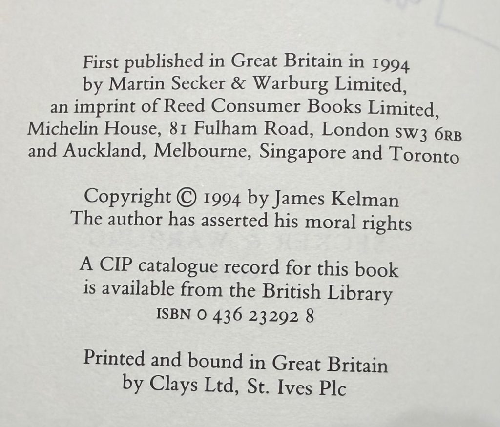 The First UK printing published by Secker & Warburg, London in 1994. 8vo., black publisher's boards, backstrip lettered in gilt; housed in the original unclipped pictorial wrapper (£14.99) by Colum Leith; with a black and white photograph of the author to the lower panel by Douglas Robertson; black endpapers; THE BOOK near Fine, lightly bumped to the upper corners; light toning to the page edges due to the quality of the paper stock used ; The WRAPPER near Fine and is protected in a removable Brodart archival cover. This copy has been signed (without dedication) by the author to the title page. Complete with a 1994 Booker Prize Shortlist Bookmark loosely inserted. Kelman's 1994 Booker Prize winning book is set in Glasgow, and follows an ex-convict, Sammy, as he wakes from a two-day binge and attempts to retrace his movements, which include beatings, blindness, nameless crimes and the disappearance of his girlfriend. Written in a stream-of-consciousness style in an uncensored Scottish dialect, the novel is a masterpiece of irony and black humour, and certainly controversial. While many praised the book for its bold and unapologetic style, one Booker Prize judge threatened to resign, calling the book 'deeply inaccessible' a 'disgrace' and 'frankly...crap'. The Times also referred to it as an act of "literary vandalism". In his acceptance speech, Kelman responded directly to the comments, stating that "A fine line can exist between elitism and racism...on matters concerning language and culture, the distinction can sometimes cease to exist altogether." He was the first Scottish writer to win the award. Scarce with such attributes.