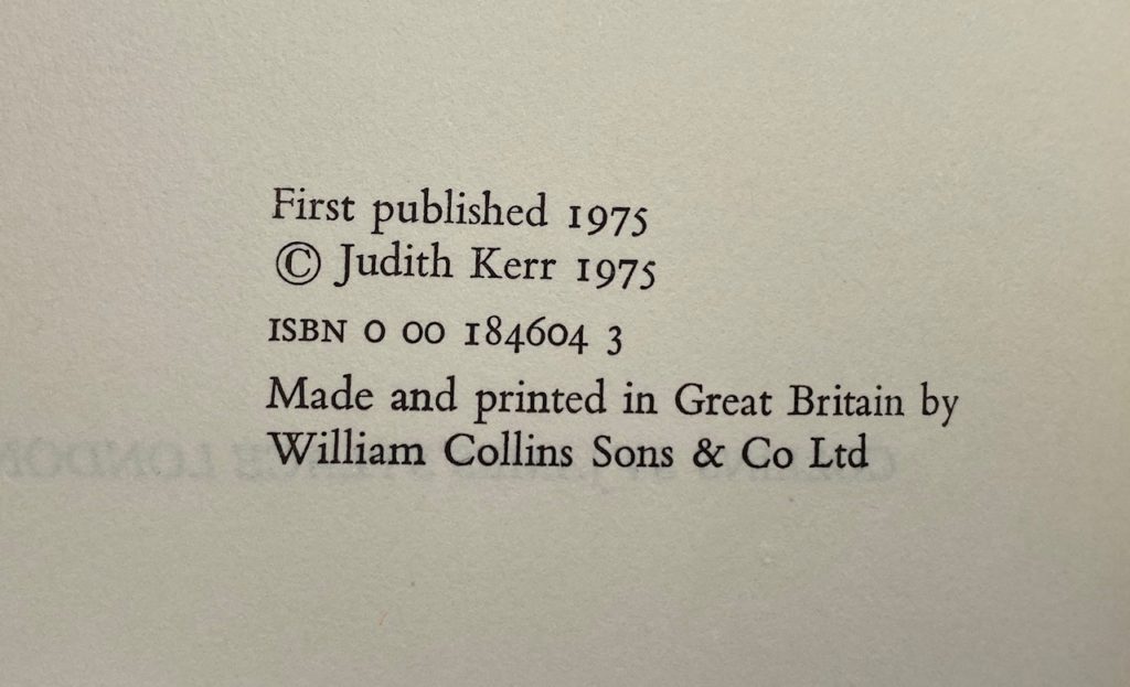 The First UK printing published by Collins, London in 1975. The BOOK is in near Fine condition with just a little pushing at the spine tips. Mild spotting to the upper text-block and some light offsetting to the blank end-papers. Free from inscriptions and erasures. The WRAPPER is complete and is in near Fine condition with very light edge-wear. One small closed tear to the upper front edge. The Michael Bell wrapper artwork looks striking in the removable Brodart archival cover. The scarce second title in the acclaimed semi-autobiographical trilogy by the acclaimed creator of 'Mog' and 'The Tiger who came to Tea'.