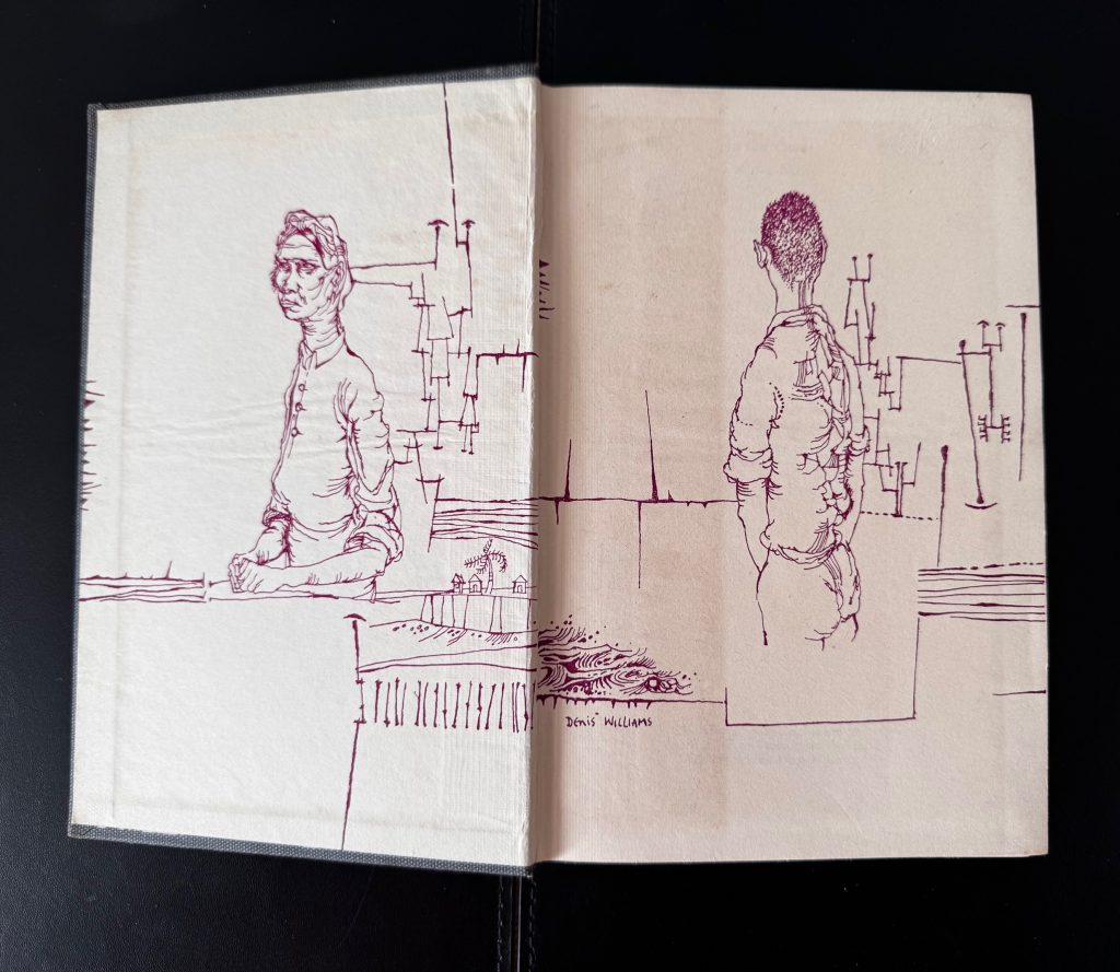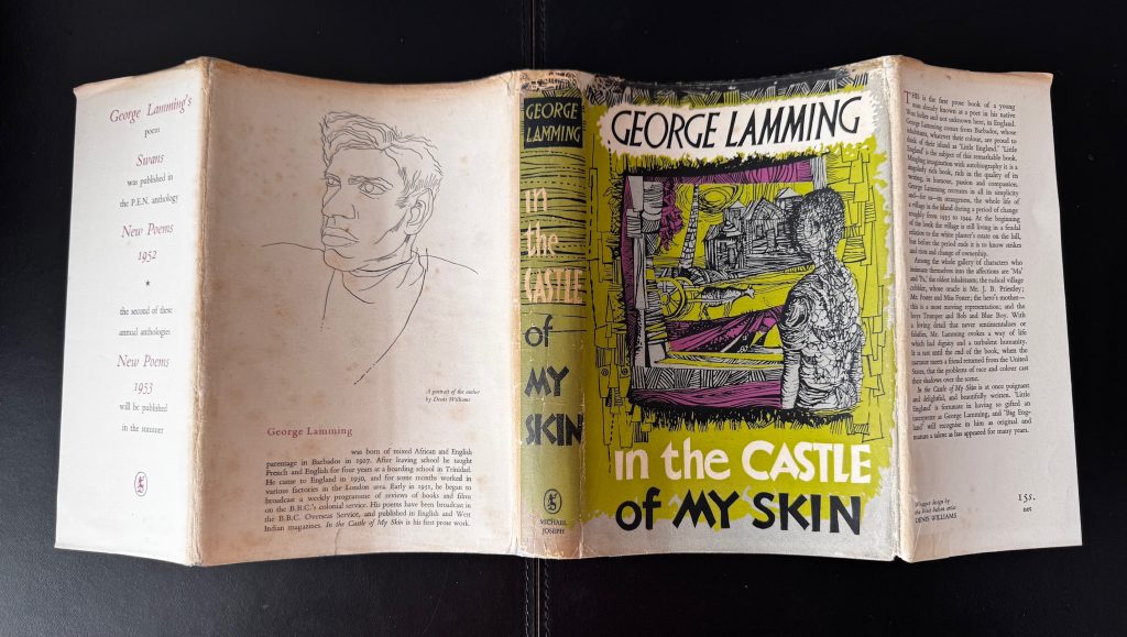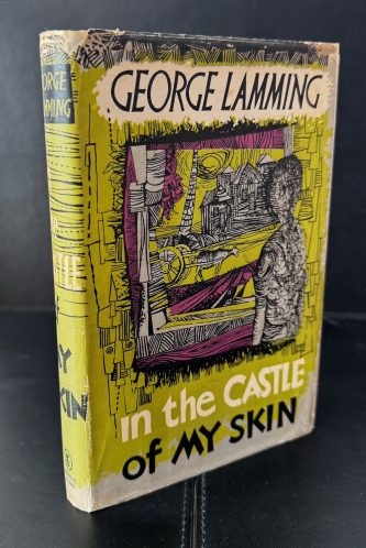 The First UK printing published by Michael Joseph, London in 1953. Original grey publisher's cloth, lettered typographically in white and gold to spine; in the unclipped pictorial wrapper (15s. net); with wrapper design, decorative purple endpapers, and frontis line drawing of the author all by West Indian Artist Denis Williams; The BOOK is in near Fine condition, mild bumping to the spine tips, with faint spotting to the outer edges of the text block; the Very Good++ WRAPPER with some even toning and spotting; creased along folds, with some nicking, chipping and short closed tears, more-so at the spine tips; one 1cm closed tear to the lower panel; repaired to the verso with tape. The wrapper is protected in a removable Brodart archival cover. The first, and widely-acclaimed autobiographical novel by the Barbadian writer George Lamming, which follows the events in a young boy's life living and growing up in the 1930s in Carrington Village, Barbados. Born in 1927, Lamming was encouraged to write by his teacher Frank Collymore, and after teaching for a number of years in Port of Spain, Trinidad, he travelled to London, where this novel was first published. It was a journey, he believed, of necessity. "I had left home", he later wrote, "to make a career as a writer. This was a journey to an expectation, and between 1948 and 1960 every West Indian novelist of significance within their region made a similar journey". Championed by such writers as Jean-Paul Sartre, the novel later won the 'Somerset Maugham Award' in 1957, and follows the coming-of-age story of a young boy, G, as he navigates the process of growing up against a backdrop of huge societal change. The title is derived from Derek Walcott's 'Epitaph for the Young' (1949): "You in the castle of your skin / I the swineherd." The book was a huge success, and praised by 'The Spectator' as "A striking piece of work, a rich and memorable feat of imaginative interpretation". A sequel, 'The Emigrants', followed in 1954. This first edition is much enhanced by the striking wrapper and endpaper design by Denis Williams, a fellow West Indian artist born in Guyana, who studied at the Camberwell School of Art in London in 1946 and lived in London for over ten years, teaching at both Central School of Art and the Slade School of Art. The author's debut novel, very scarce in this condition.