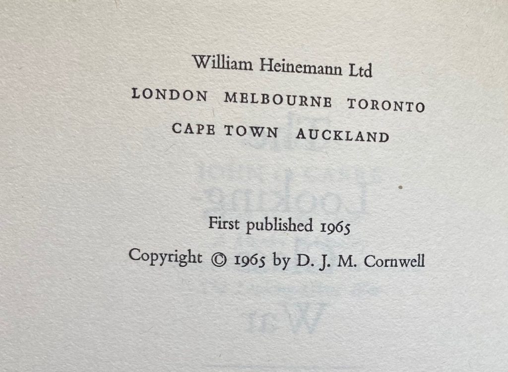 The First UK printing published by Heinemann, London in 1965. The BOOK is in near Fine condition with just some very light toning to the text-block. A hint of spotting to the lower text-block. Free from inscriptions. The WRAPPER is neatly price-clipped and is in near Fine condition. Some very light edge-wear at the upper spine end. The colouring to the spine remains very bright with just very slight fading of the red colouring to the spine but far less so than usually encountered. Please ignore the white patches in the images which are just reflective glare. The wrapper is protected in a removable Brodart archival cover. The book has been double signed (without dedication) by the author to the title page : 'John Le Carre a.k.a. David Cornwell'. A very collectible copy of the author's fourth title and very scarce to find as such double signed. More images available on request. Ashton Rare Books welcomes direct contact.