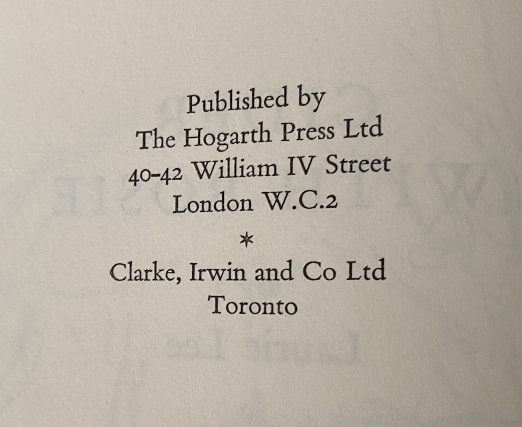 The First UK printing published by The Hogarth Press, London in 1959. The correct first issue with the mention of 'a fire at the piano-works almost every year' to page 272. This was subsequently removed in later printings. The BOOK is in Very Good++ or better condition. Original green boards with gilt titling to the spine. A hint of pushing at the spine ends. Some light toning and spotting to the text-block. A neat previous owner's penned name and date to the top and bottom of the front blank end-paper. The WRAPPER is complete and is in Very Good++ condition. It is the correct first issue. Slight loss at the spine ends and corners. A little light rubbing in places. Mild toning to the spine and upper flap edges. The John Ward wrapper artwork looks very striking in the removable Brodart archival cover. The book has been signed (without dedication) by the author to the front blank end-paper. The first title in Laure Lee's acclaimed trilogy. (S. Oliver-Jones A10). Scarce with such attributes.