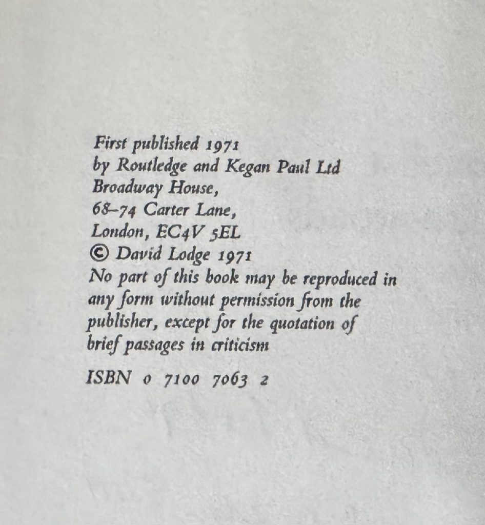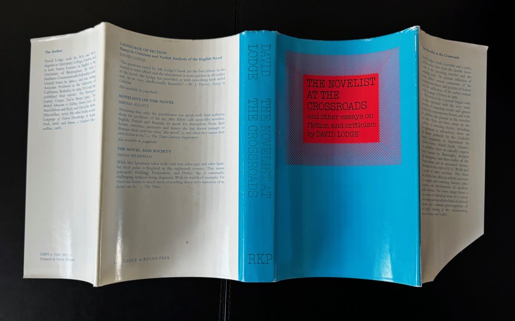 The First UK printing published by Routledge & Kegan Paul, London in 1971. The BOOK is in near Fine condition. Some mild pushing to the spine tips. Light spotting to the text-block and blank-endpapers. Free from inscriptions. The neatly price-clipped WRAPPER is complete and is in near Fine condition. A hint of edge-wear with a little rubbing to the upper spine tips, folds and corners. No fading of colouring to the spine. The wrapper is protected in a removable Brodart archival cover. The book has been signed (without dedication) and dated to the title page : 'David Lodge, 7th October 2011'. The contents includes pieces on Graham Greene, John Updike, William Burroughs, Muriel Spark and Samuel Beckett et al. Very Scarce to find with such attributes.