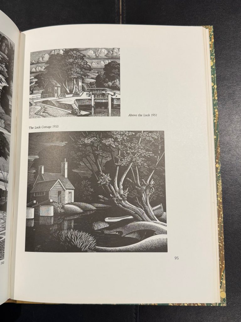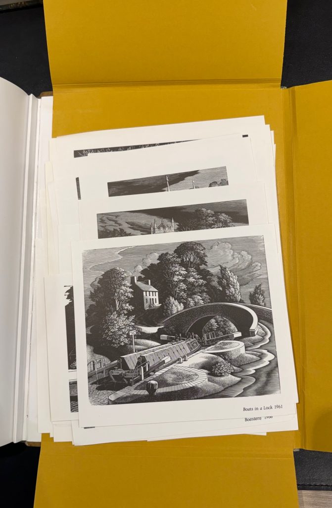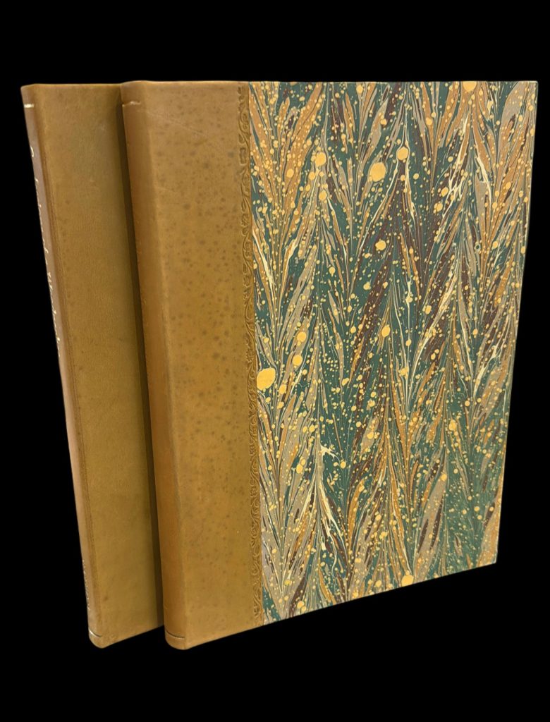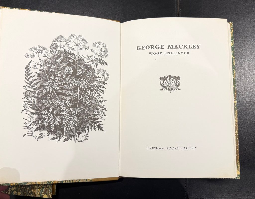 The First UK printings published by The Gresham Press (Gresham Books Ltd), Old Woking in 1981. 2 Vols., small Folios; finely hand-bound by E. A. Weeks & Son in quarter blind-stamped calf over marbled paper-covered boards; spines lettered and lined in gilt; numerous reproduced engravings throughout both texts, as well as an additional suite of 62 loose plates housed in a flap-case to the rear of 'Confessions' as issued ; The BOOKS very near Fine copies both, with light scattered foxing to the calf, mostly affecting 'George Mackley'. The books are protected in removable Mylar covers. A wonderful set of two important books by George Mackley. 'Confessions' limited to just 250 hand numbered copies, this no. '89', signed by Mackley to the limitation page. The book was produced as part of a memento of the exhibition of his wood engravings at the Ashmolean Museum in Oxford in November 1981. Also included here is a rather modest four page H/W letter from Mackley to fellow artist Ann Le Bas, thanking her for her kind words regarding his MBE. Mackley recalls a trip taken to Winsford, when he was caught in a rainstorm with his wife and her family and took refuge in a nearby pub. He goes on "what fine support you and Monica [Poole] have given to the painter-etchers. You have spent many hours working when help was needed." Dated in 1983, the artist continues "As I fear is only too apparent, writing has become difficult for me. As fatigue sets in, calligraphy, spelling and sensible expression falter... my first stroke completely destroyed my engraving skills, such as they were". He concludes "I hope that you are pursuing your pleasure in the practice of your favourite media and that you are meeting with success of every kind. I see that my strength is failing, so I will thank you for your sending one of the kindest messages which I have received from anybody and ask you to accept my very best wishes. May all go well with you." Mackley passed away just a few months after this letter was written, and a newspaper clipping containing an obituary is also loosely included with this set. The recipient, (Rachel) Ann Le Bas was born in 1923, and studied at the City & Guilds of London Art School under A. R. Middleton Todd, Rodney Burn and Henry Wilkinson. Living and working in Exmoor for the majority of her life, she was elected member of the Royal Society for Painter-Etchers and Engravers in 1960, the Art Workers Guild in 1969, and the New English Art Club in 1972. Her artworks drew heavily on her surroundings, from cityscapes to countryside scenes of her beloved West Country, as well as still life and interiors. A profusely illustrated compendium of the works of George Mackley (1900-1983), a much-loved British artist who was trained as a teacher of art at the Goldsmiths' College in London before discovering the art of wood engraving through Noel Rooke, one of the founders of the Society of Wood Engravers). A fabulous association set.