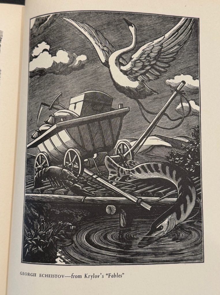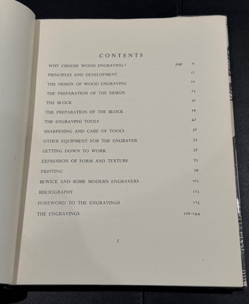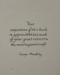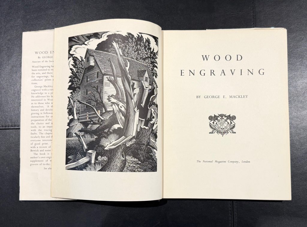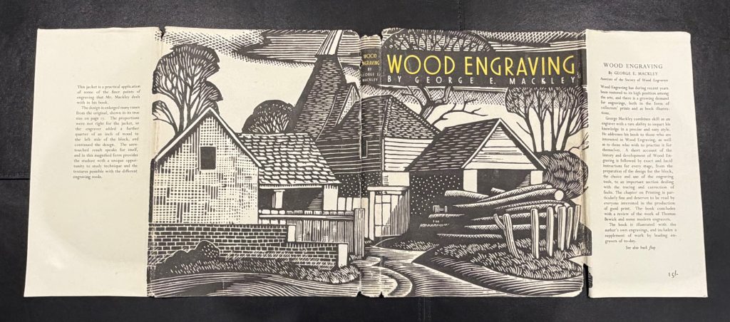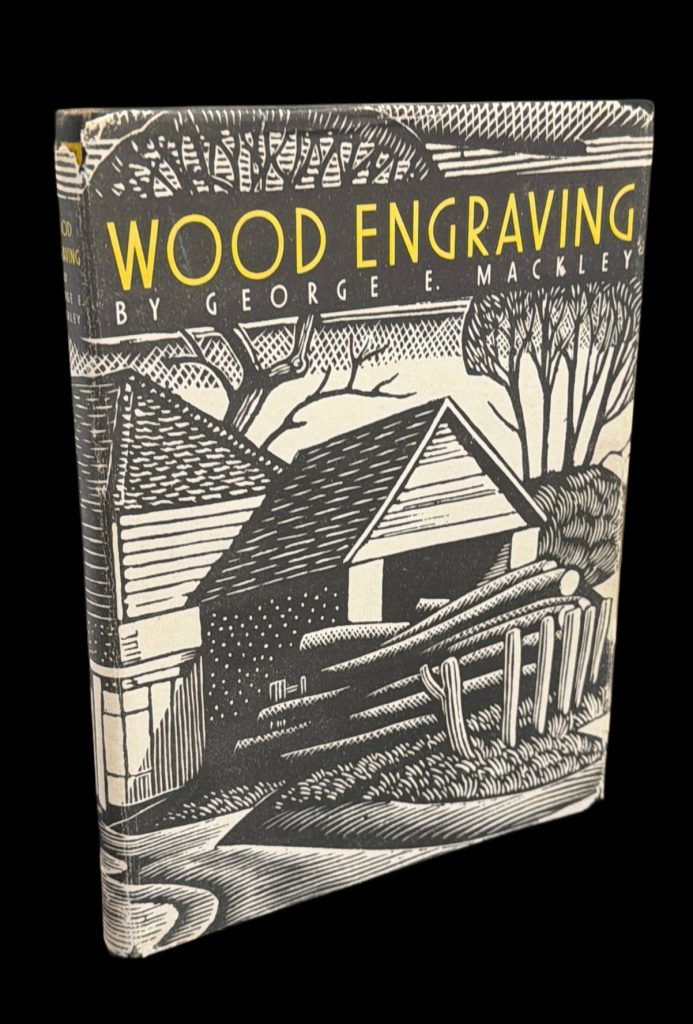 The First UK printing published by The National Magazine Company, London in 1948. 8vo., black cloth, title lettered in yellow to upper cover and backstrip; together in the very elusive unclipped pictorial wrapper (15/- to front flap); upper edge yellow top-stain faded ; with frontis engraving, and numerous other illustrations in black and white throughout text, including several diagrams and engravings by the artist; The BOOK a very good example with some very light mottling to boards; a little rubbed at spine tips; light spotting mostly affecting endpapers, prelims and upper edge; The scarce WRAPPER is in Very Good++ condition , a little rubbed along spine and folds, with two small holes to the lower panel and some losses to the head and foot, up to 1cm in depth, not affecting lettering. The wrapper is protected in a removable Brodart archival cover. This copy inscribed by George Mackley to the front end-paper : "Your acquisition of this book is appreciated as a mark of your great interest in the woodengraver's craft, George Mackley". Together with five blank notecards featuring wood engravings, the two in colour 'hand printed from the box-wood block engraved by George Mackley' and initialed by him in pencil; and a folded handwritten letter, written in black ink by Mackley to Laurence Lee, the stained glass artist, together with the original hand-addressed, stamped envelope. Dated Christmas 1980, Mackley remembers Iain McNab (the noted wood engraver, who passed away in 1967), and apologises for not being able to send him a card "as you may know, the Society for the Maintenance of Aesthetic Standards struck me off their roll years ago and in consequence, wood blocks rest safely in their beds with no pressure from me". "If gravers cannot make marks on wood, a pen can still make marks on paper", he writes, "The marks here made are to the effect that I wish you a very happy Christmas." "The engraving practice in which I was engaged ended long ago", he concludes, "It is, however, very kind of you to take such a keen interest in the exhumation". A lovely first edition of this important book on the subject and craft of wood engraving, with chapters ranging from design, to preparation of the block, engraving tools and printing, and final sections concerning the works of Thomas Bewick and some other modern wood engravings. Copiously illustrated throughout, the book ends with eighteen pages of plates depicting the works of Agnes Miller Parker, Blair Hughes-Stanton, Gertrude Hermes and many others. George Mackley (1900-1983) was trained as a teacher of art at the Goldsmiths' College in London before discovering the art of wood engraving through Noel Rooke, one of the founders of the Society of Wood Engravers. This publication is still considered today to be one of the most important manuals concerning wood engraving techniques. The scarce first issue, with wonderful association material.