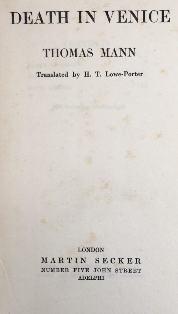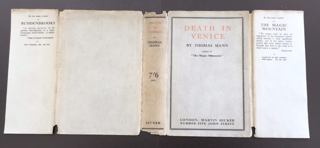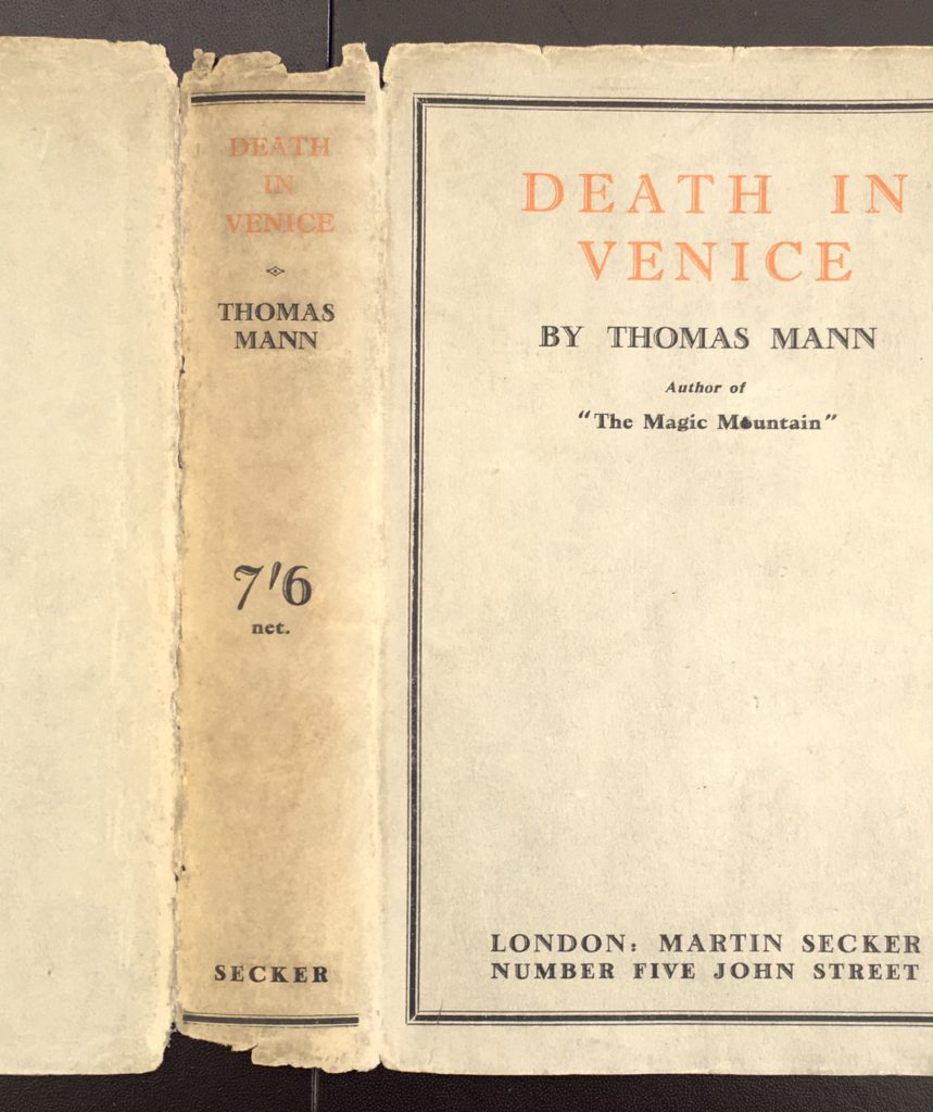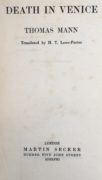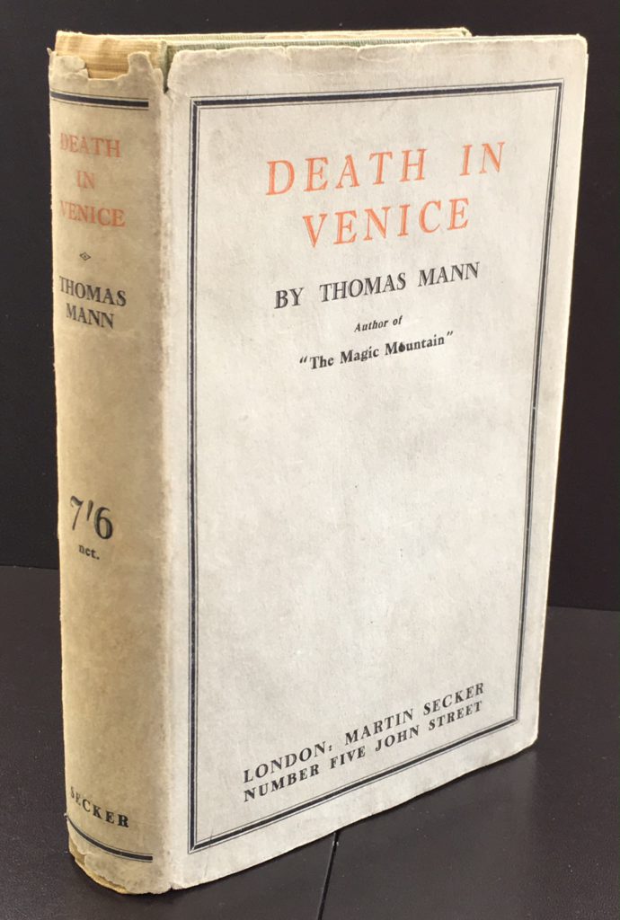 The First UK Printing published by Secker and Warburg in 1928. The BOOK is in Very Good++ condition. Ghosting to the spine, spine folds and the lower boards as commonly encountered. The gilt titling remains bright. A little pushing at the spine ends. Slight splaying of the rear board. Mild toning and spotting to the text block. Mild offsetting and spotting to the end papers with very light spotting in places elsewhere due to the quality of the paper stock used. Free from inscriptions and erasures. A very small 'Times Book Club sticker' to the lower rear pastedown which has offset onto the verso of the rear end paper. The binding remains very tight. The WRAPPER is complete and is in Very Good+ condition. It bears the correct price of 7'6 net to the spine. Light toning to the spine and edges. Mild edge wear with loss at the spine ends and corner folds. Some splitting at the rear spine fold. The wrapper looks very attractive in the removable Brodart archival cover. The Nobel-Prize winning author's famous novella which was the basis for Luchino Visconti's 1971 Oscar-nominated movie starring Dirk Bogarde and a Benjamin Britten's opera. Very scarce to find with such attributes.
