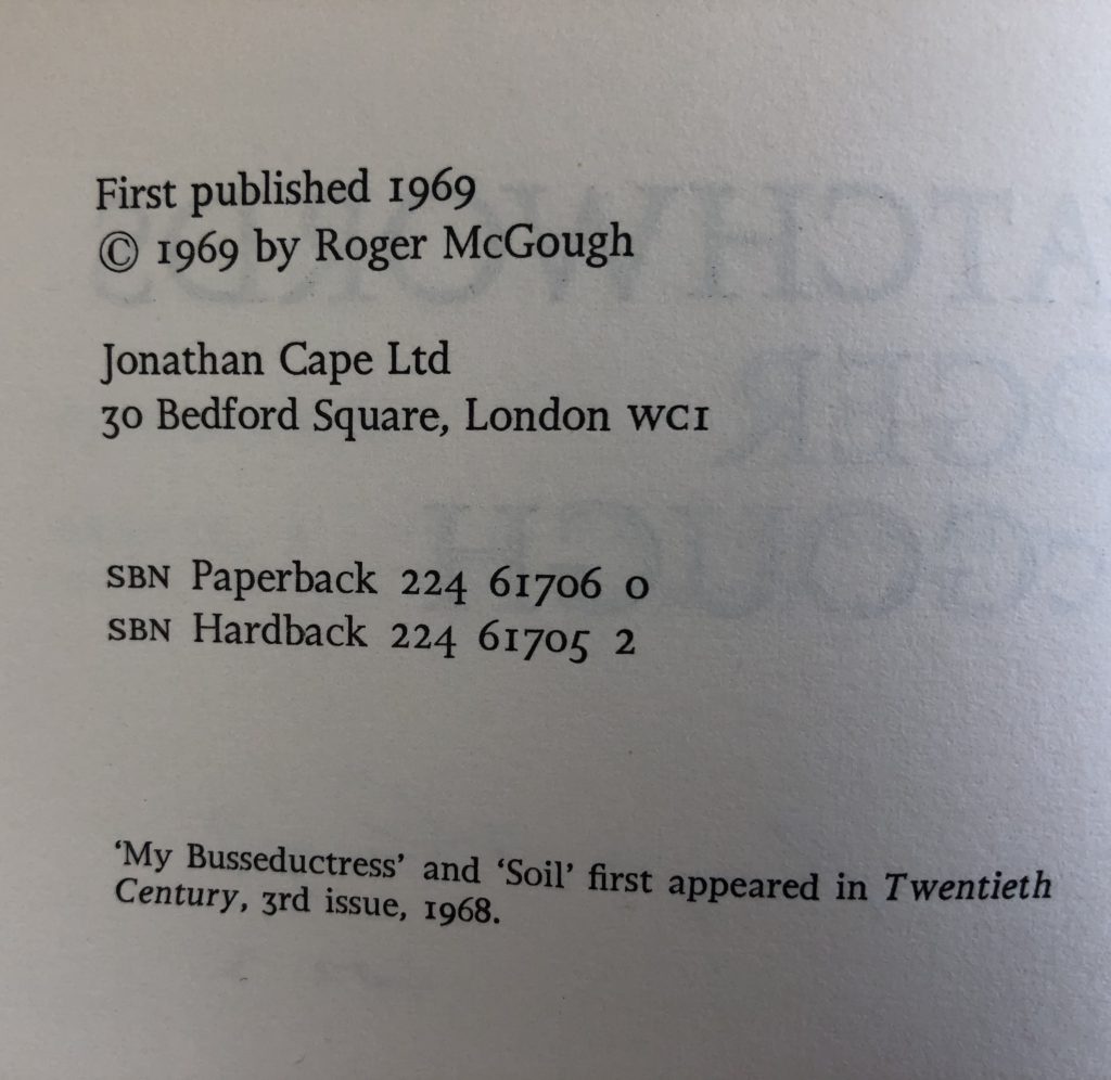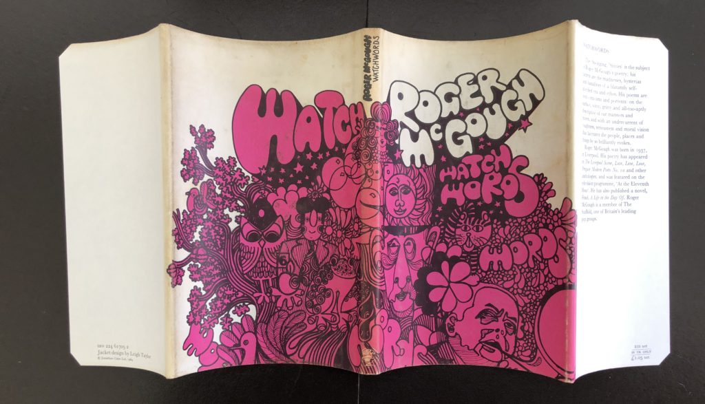 The First UK printing published by Jonathan Cape in 1969. This is the scarce Hardback edition which was released in a very small print run. The BOOK is in near FINE condition. The upper text block is a little toned and dusty with a little toning to the page edges. Free from inscriptions and erasures. The WRAPPER is complete and is in Very Good+ condition. The spine has a hint of toning and the white background colouring on the wraparound design is slightly marked and toned in places (see images). The period wrapper artwork by LEIGH TAYLOR looks very striking and evocative of the time in the removable Brodart archival protector. The book has been Signed and Dated by the author to the title page. McGough's first collection and extremely scarce in this casebound state with these attributes.